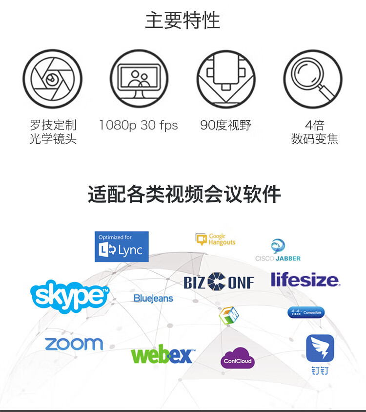 • 商品名称:罗技(Logitech)C930c高清网络摄像头 1080P 4倍数码变焦 90度超广角 商务会议 中小型视频会议 C930c/个