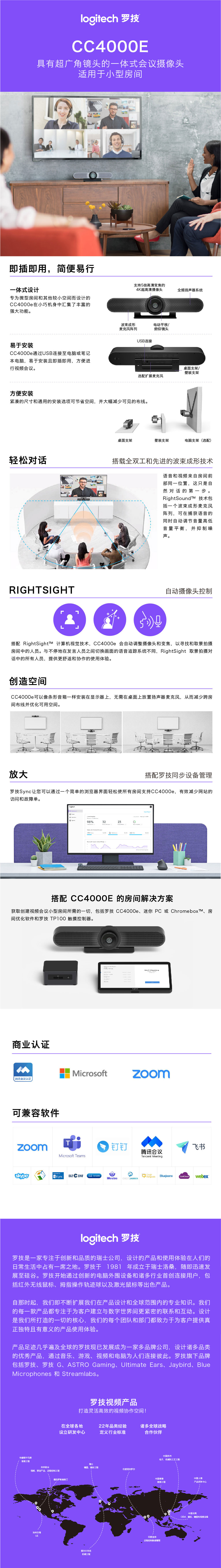 • 商品名称:罗技罗技CC4000e会议摄像头麦克风一体式商务高清视频4K超清5倍数字变焦120度广角一体机 CC4000e/个