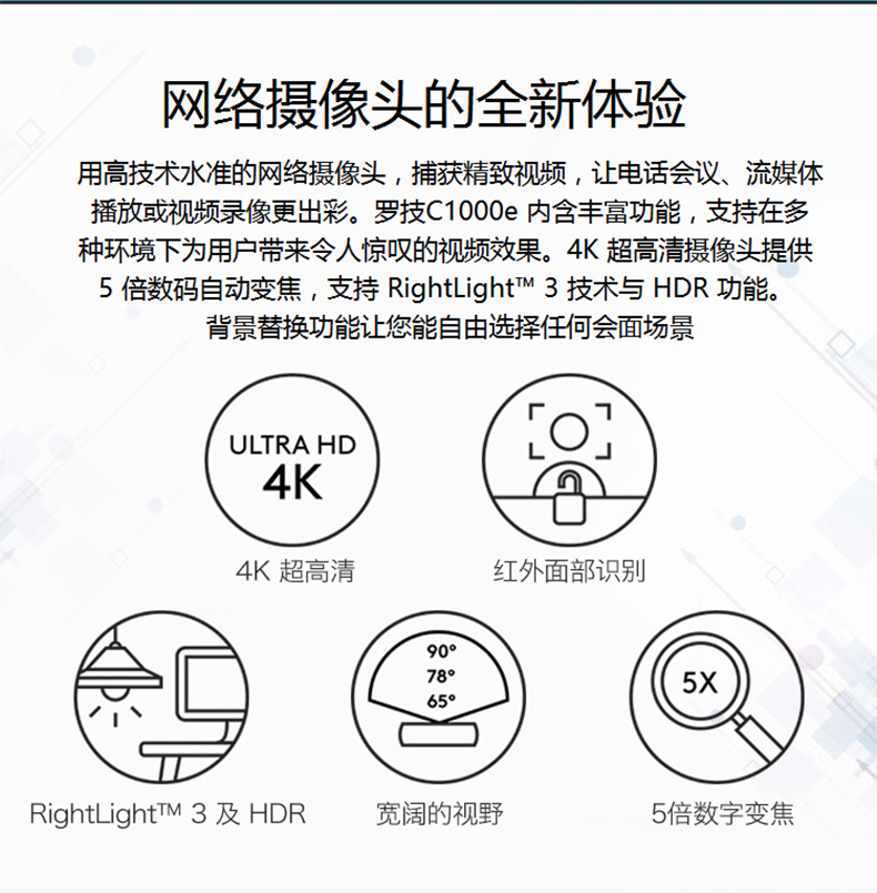 • 商品名称:罗技(Logitech)C1000e 4K超高清商务网络摄像头广角带麦克风 电脑笔记本直播会议摄像头 C1000E C1000e /个