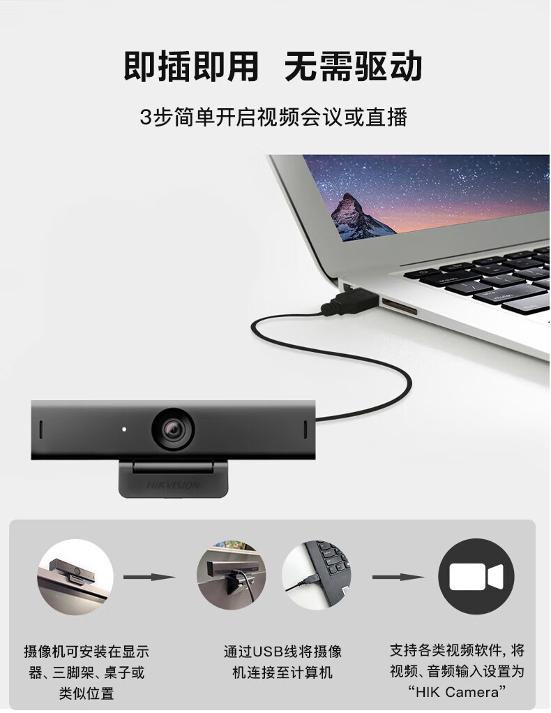 • 商品名称:海康威视摄像头电脑直播400万2K高清带麦克风USB免驱外接笔记本台式机网课家用视频会议办公直播带货DS-U64 DS-U64/台