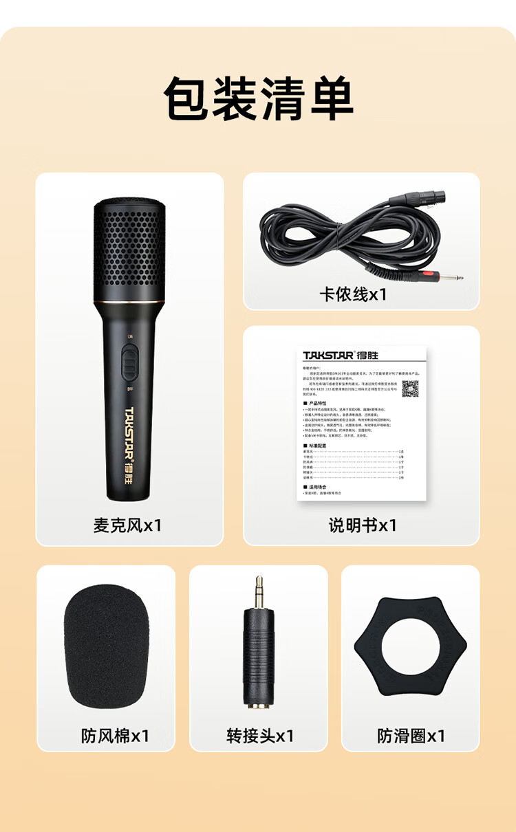 包装清单: • 麦克风 1支 • 卡侬线 1条 • 防风棉 1个 • 防滑圈 1个 • 转接头 1个 • 说明书 1份