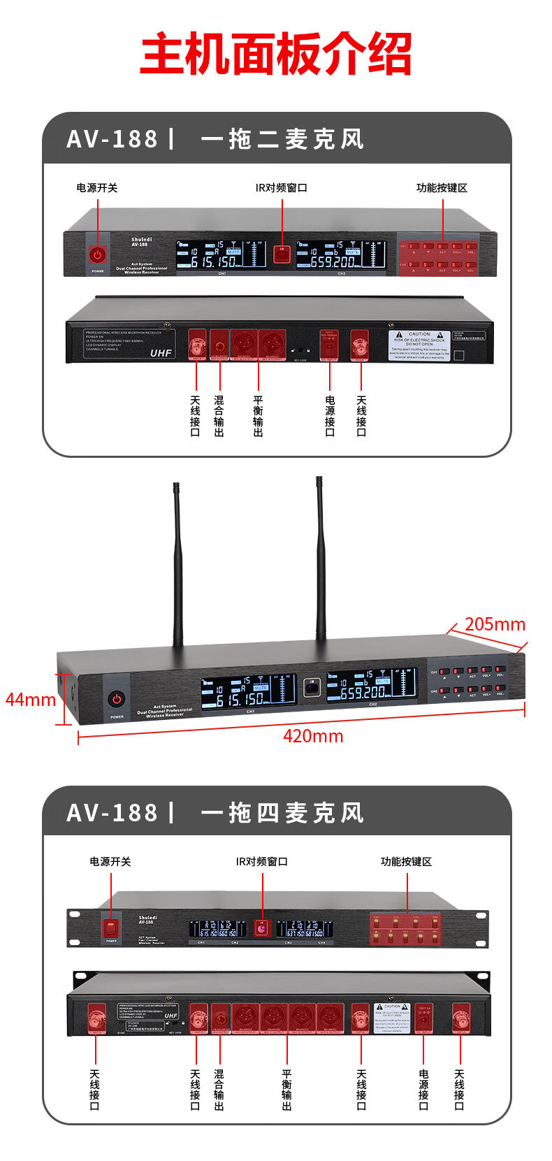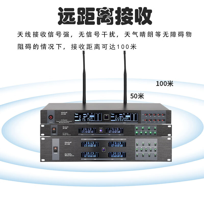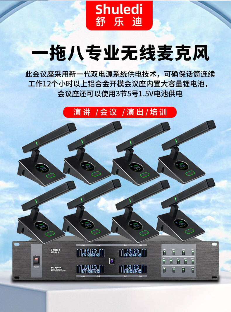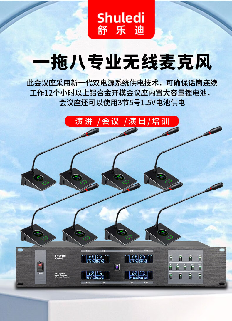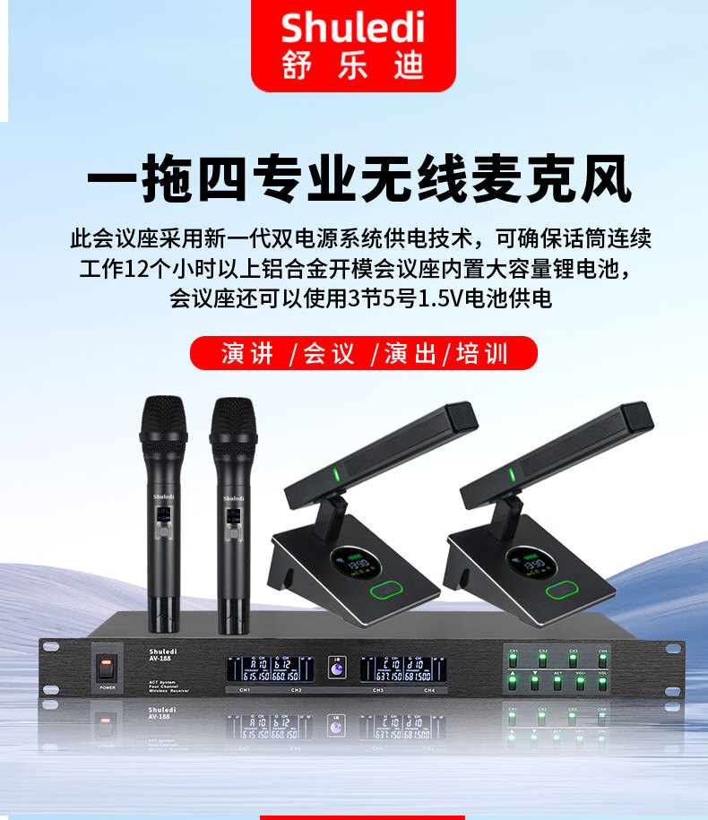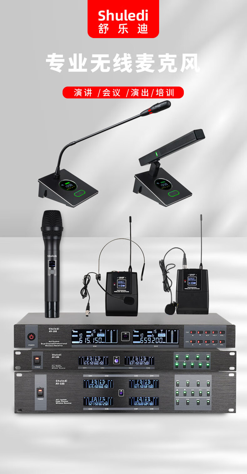 • 商品名称:舒乐迪(shuledi)AV-188国产化会议室U段无线话筒一拖二 可调频一键对频培训演讲K歌手持话筒麦克风(配2手持可充电 AV-188/套