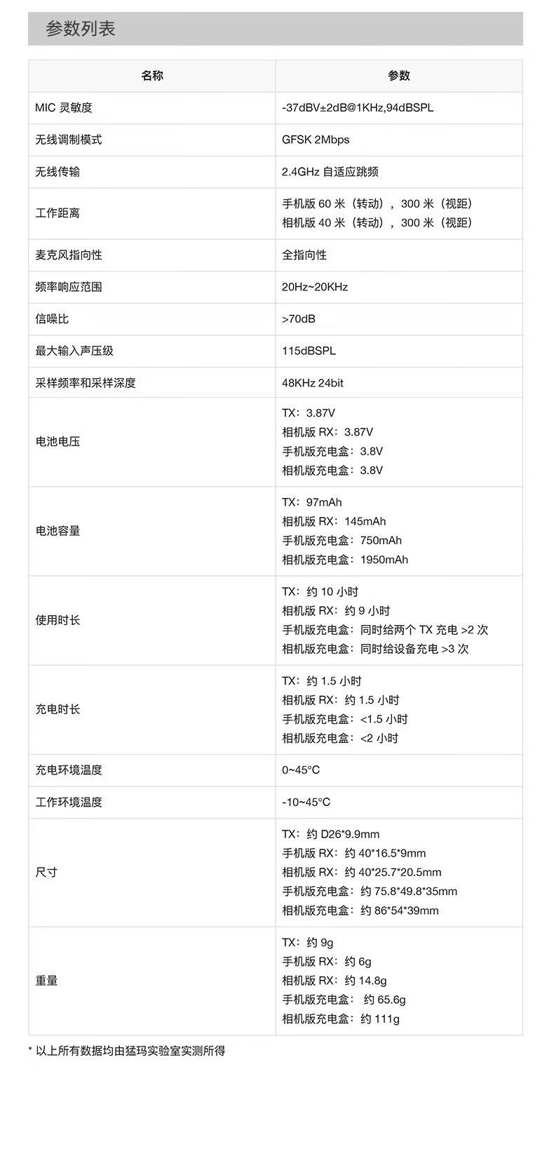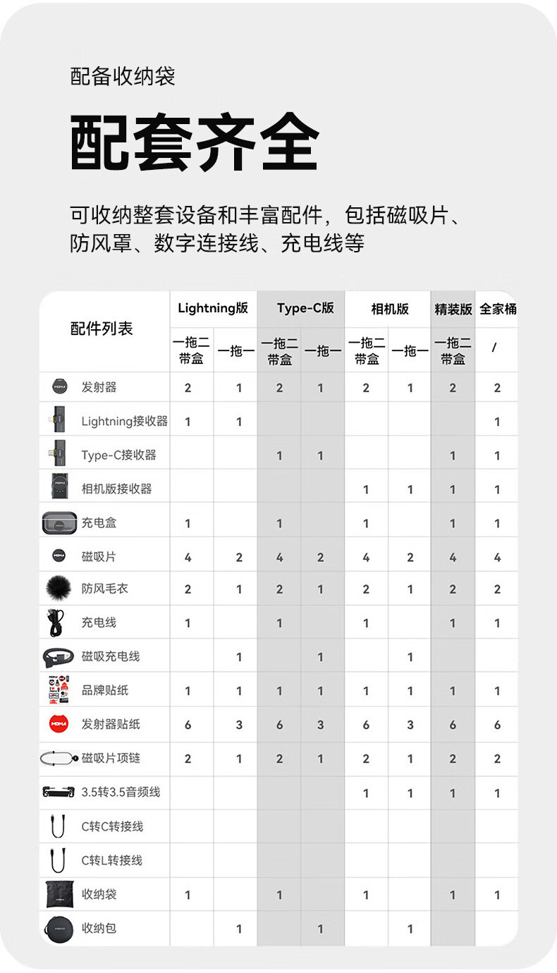 包装清单: TX*2、Type-C RX*1、TX防风毛衣*2、手机版充电盒*1、USB Type-A To Type-C 充电线*1、说明书*1、保修卡*1、数字卡*1、合格证*1、包装清单卡*1、磁吸片*4、个性化贴纸*1、TX贴纸*1、磁吸片硅胶项链*2