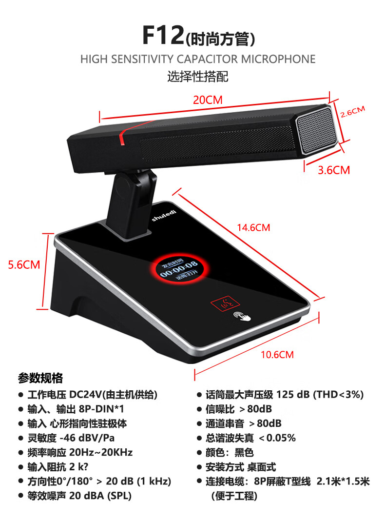 • 商品名称:舒乐迪(shuledi)F12会议室专业有线手拉手会议话筒麦克风 会议室桌面麦克风网线八芯线两用接话筒网线0.5米 F-12/套