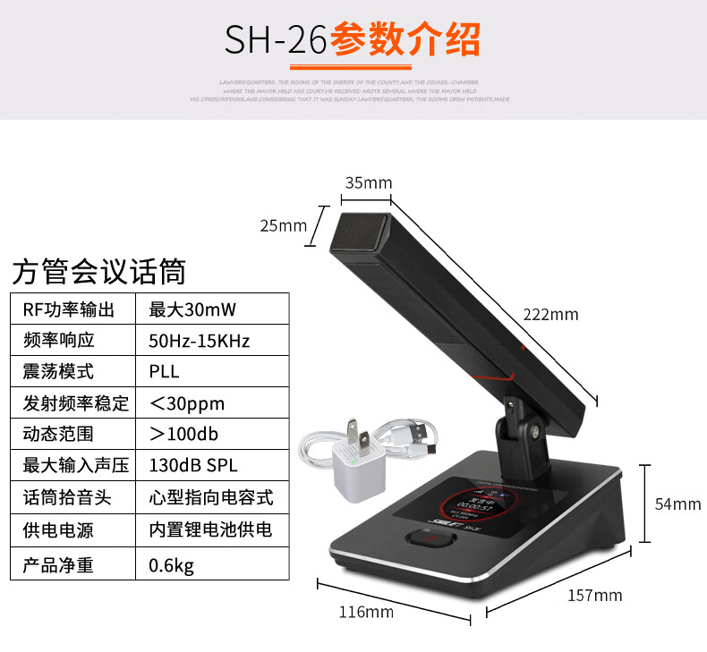 包装清单: SH-26主机 × 1、手持 ×2、会议方管× 2、电源适配器 × 1、6.5音频线 × 1、说明书 × 1、保修卡 × 1;