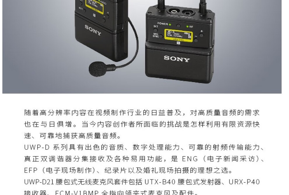 • 商品名称:索尼(SONY)UWP-D21无线小蜜蜂 直播收音设备 领夹式无线话筒麦克风 一拖一话筒 微单单反摄像机话筒 UWP-D21/箱