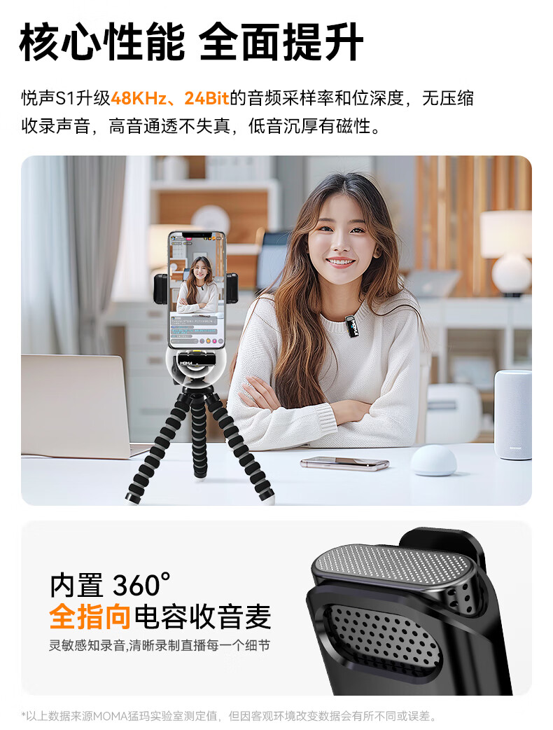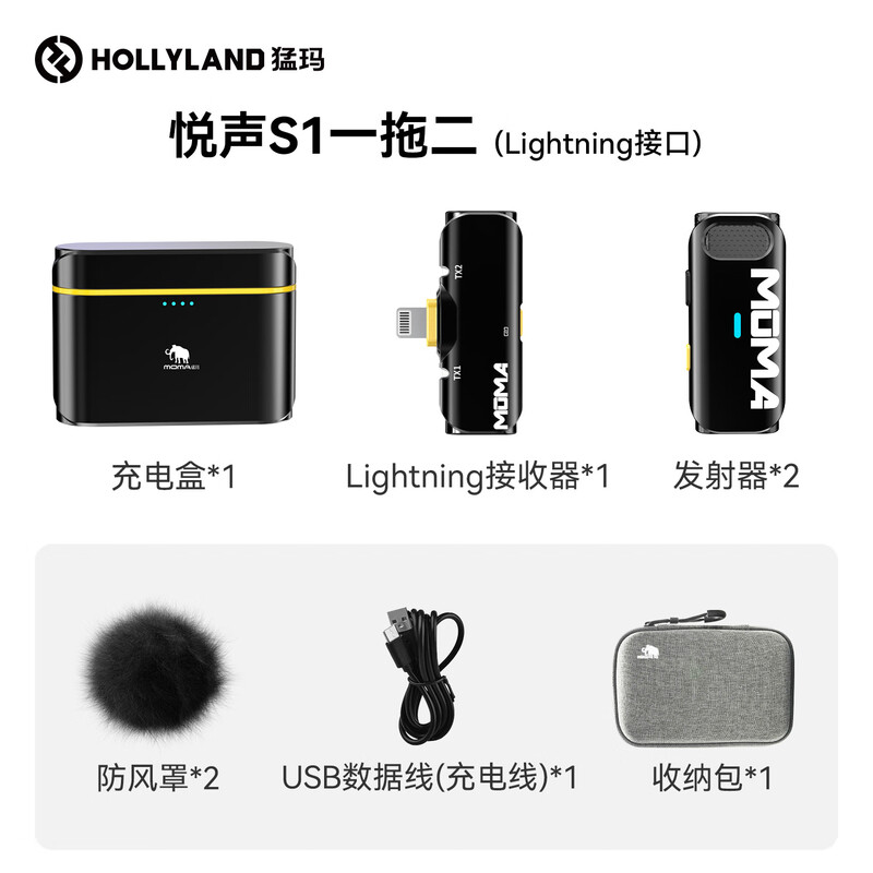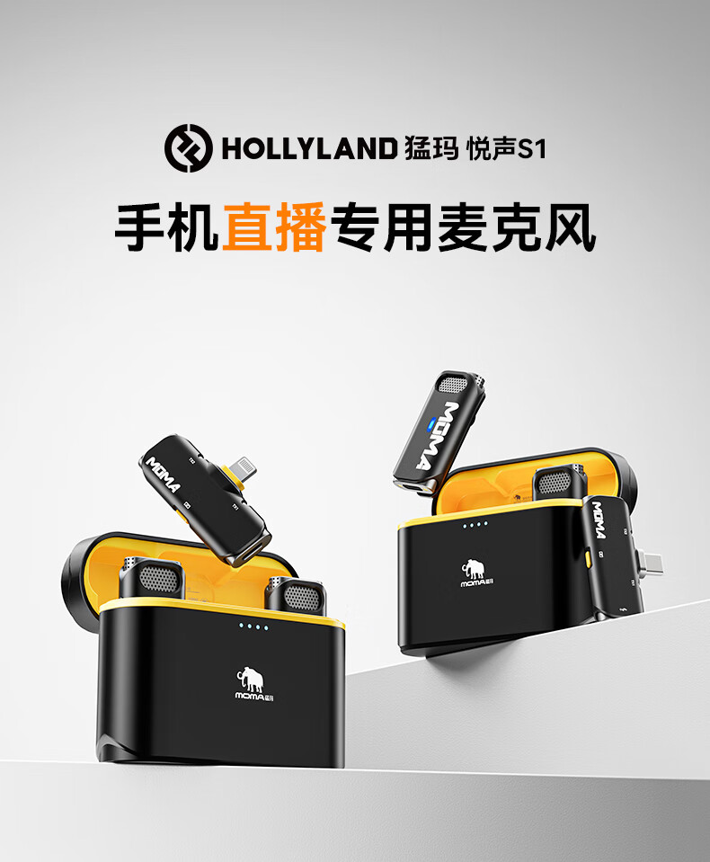 • 商品名称:猛玛悦声S1无线领夹麦克风 苹果手机直播MOMA猛犸s1一拖二话筒vlog户外采访录音声卡降噪长续航收音麦 悦声 S1/件