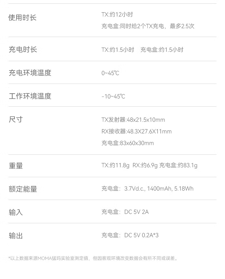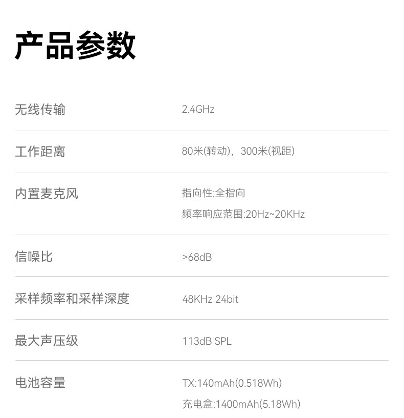包装清单: 充电盒*1、 TX发射器*2、 RX接收器*1、 Type-A to Type-C充电线*1、 防风罩*2、 说明书*1、 保修卡*1、 收纳包*1