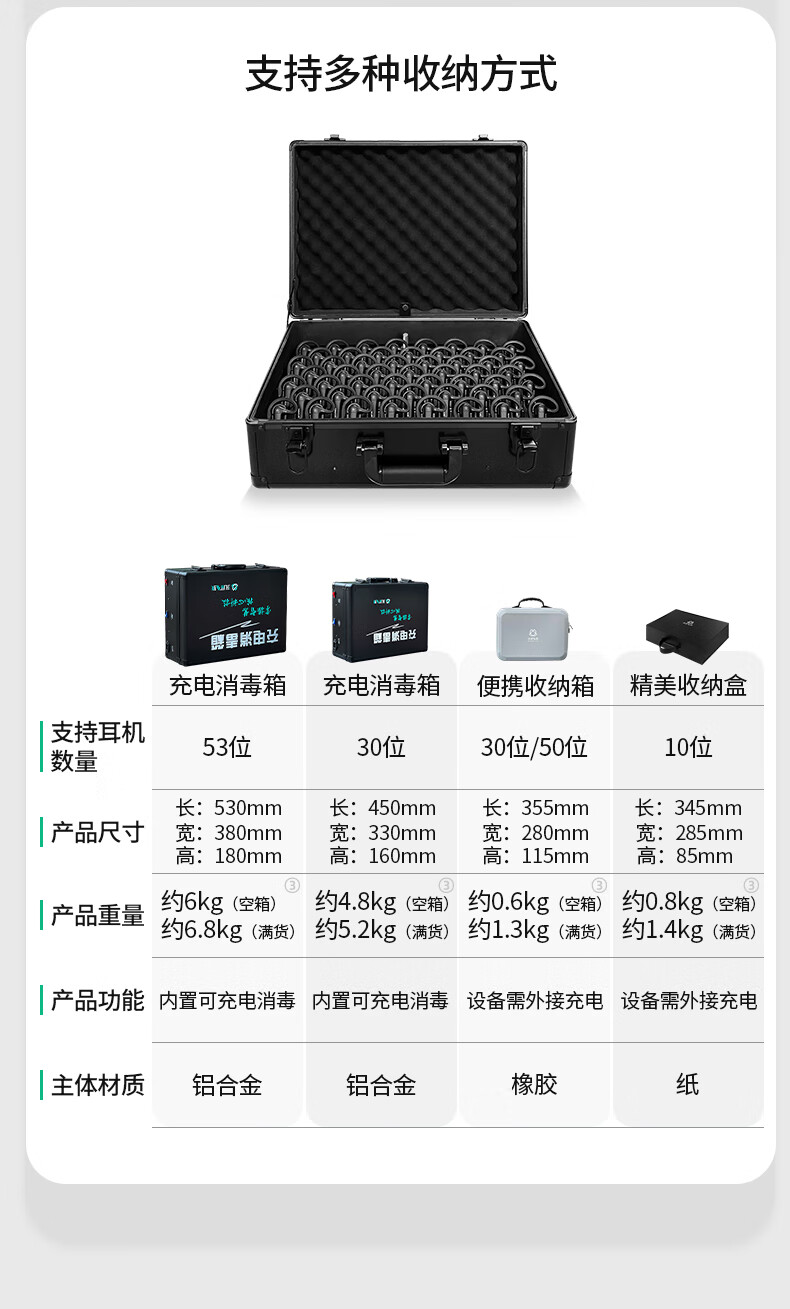 包装清单: 1个领夹发射器,20个不入耳接收耳机,1个充电消毒箱,数据线