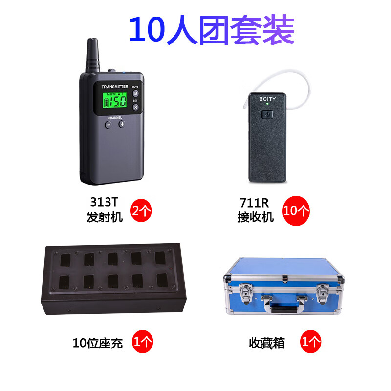 商品名称: 比西特 无线讲解器一对多解说器同声传译耳机bcity711R讲解器培训会议工厂参观 双讲+10人听+10位座充+收纳箱 711R套装/箱