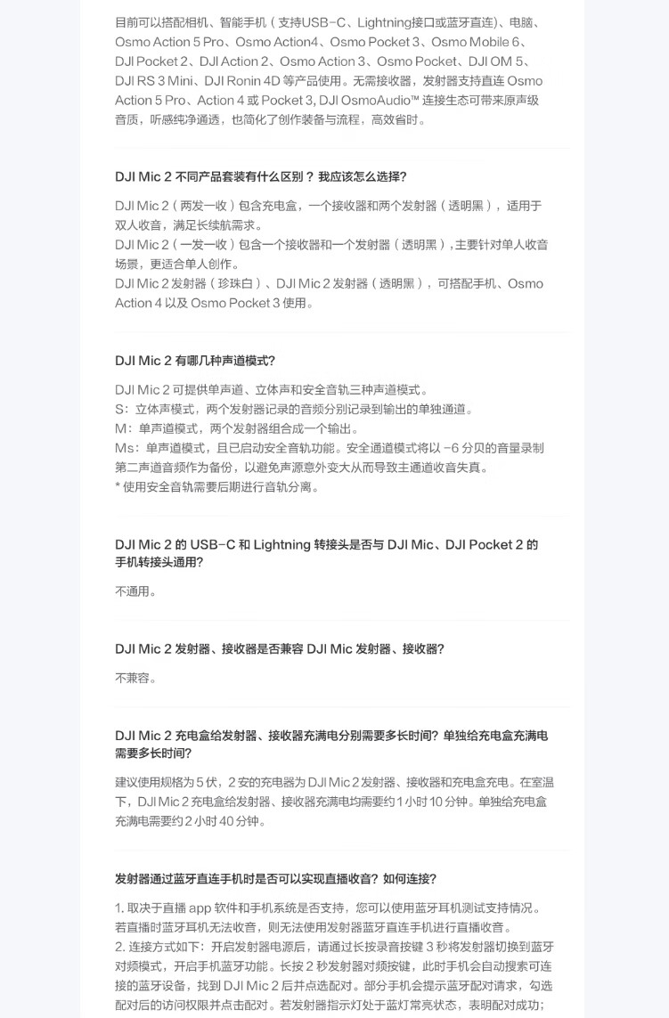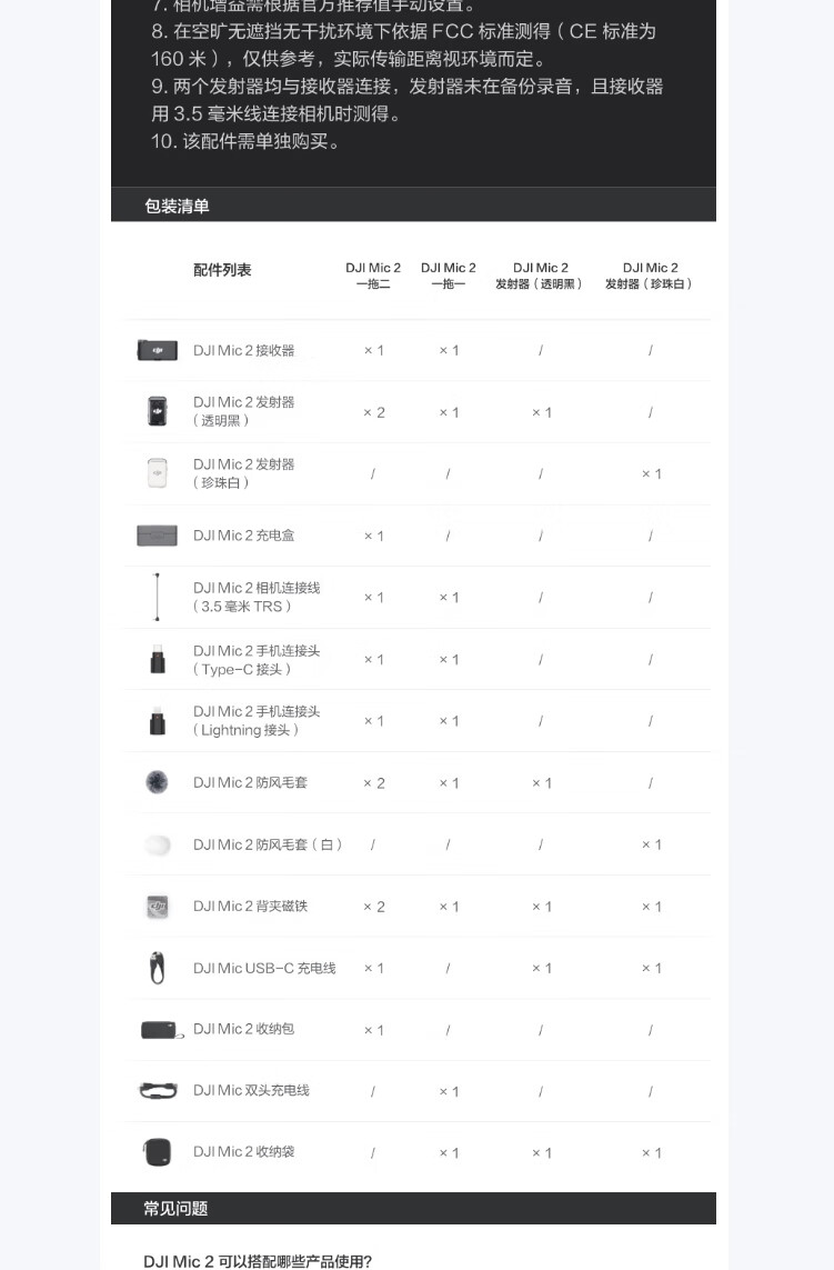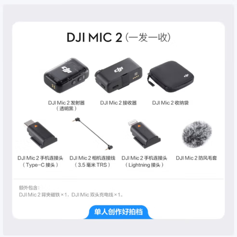 包装清单: DJI Mic 2 接收器 ×1,DJI Mic 2 发射器(透明黑) ×1,相机连接线(3.5 毫米TRS) ×1,手机转接头(Type-C接头) ×1,手机连接头(Lightning接头) ×1,防风毛套 ×1,背夹磁铁 ×1,双头充电线 ×1,收纳袋 ×1