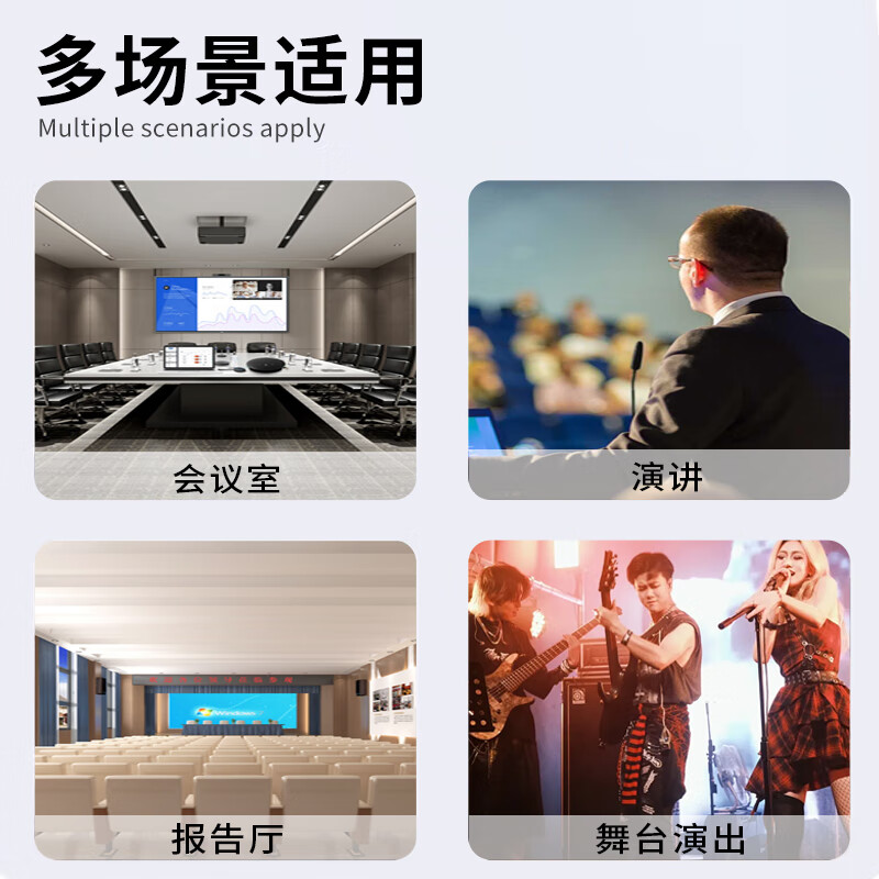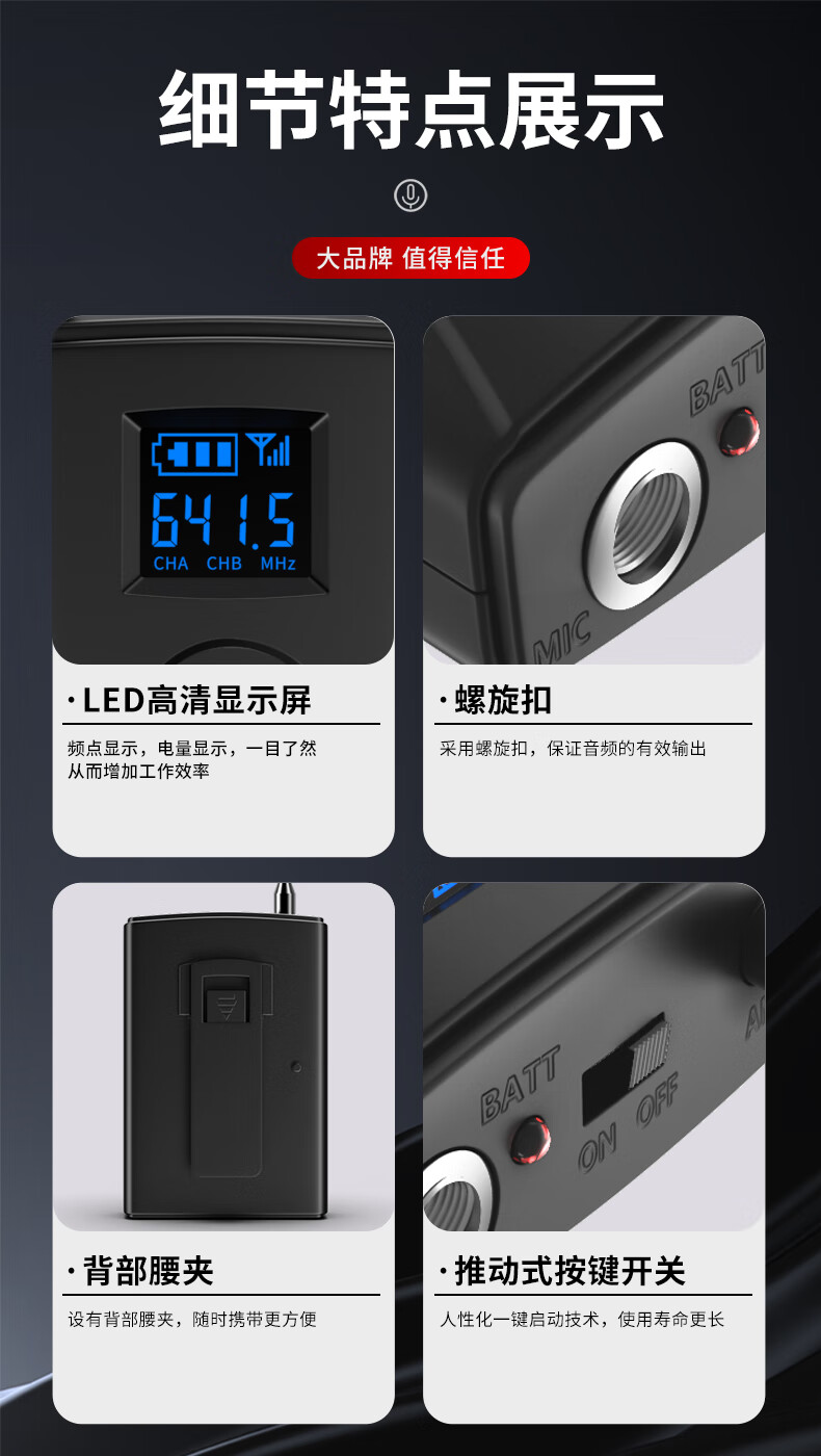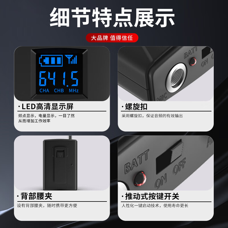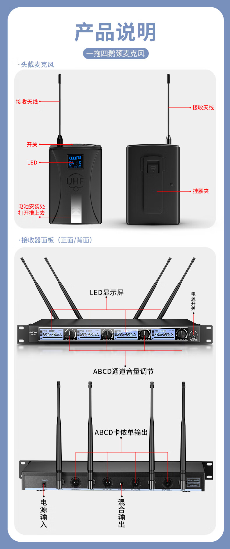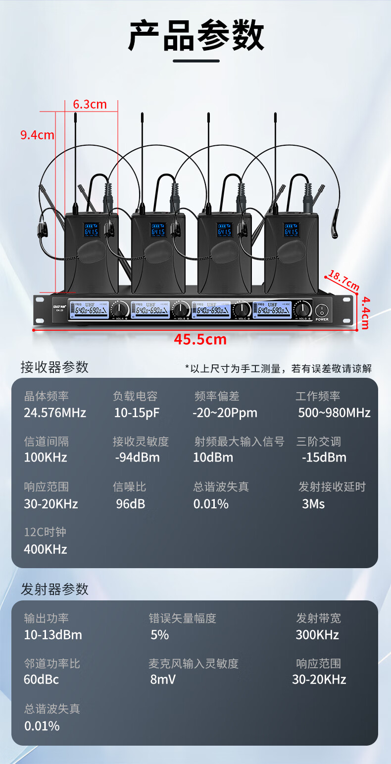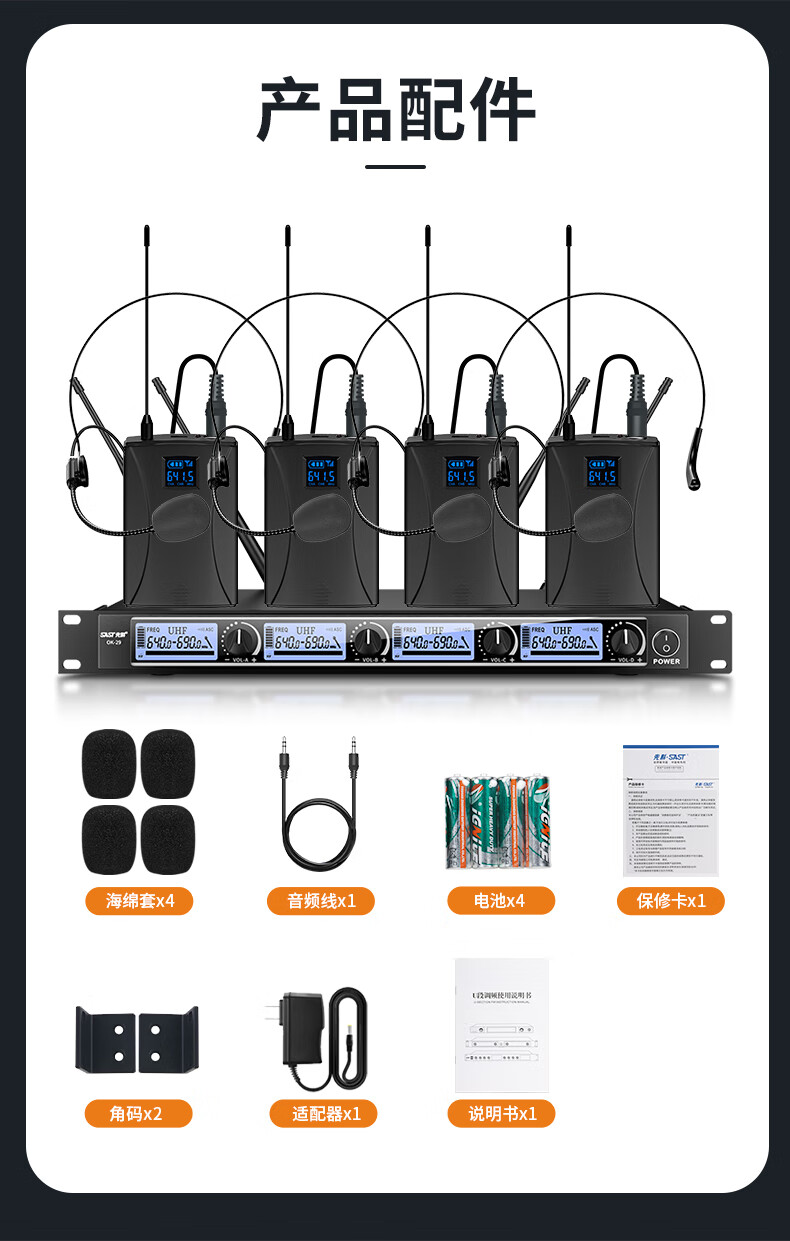 包装清单: 腰包*4 头戴麦x4 主机x1 保修卡x1 说明书x1 电源适配器x1 音频线x1 电池x8 防风罩x4 角码*2