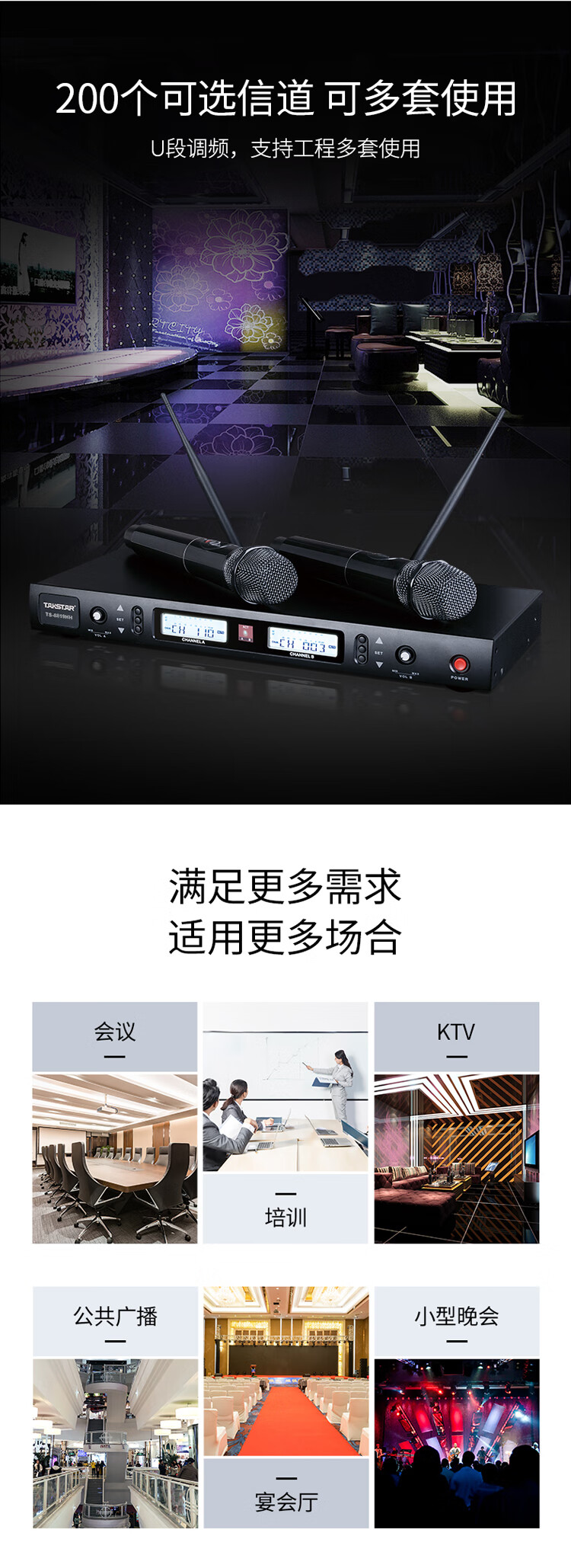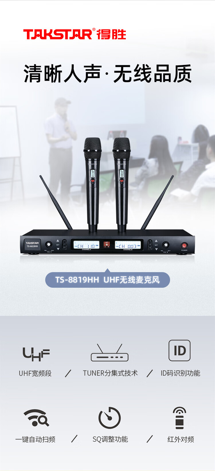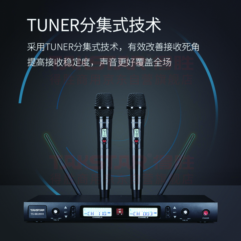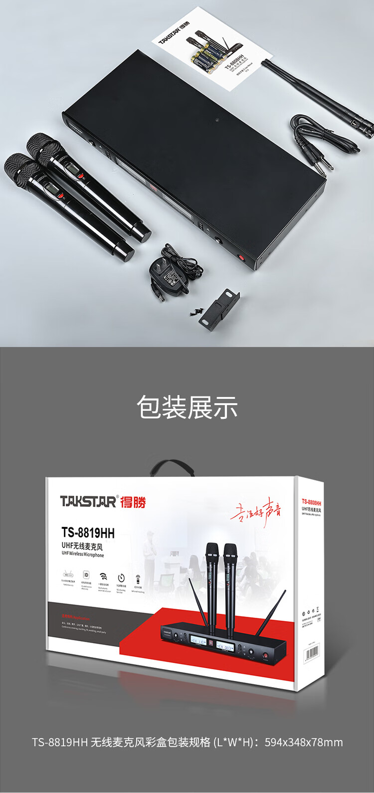 • 商品名称:得胜(TAKSTAR)TS-8819HH 一拖二无线手持麦克风 U段无线双手持话筒 高保真分级式 主持演讲培训广播婚庆晚会 TS-8819/套