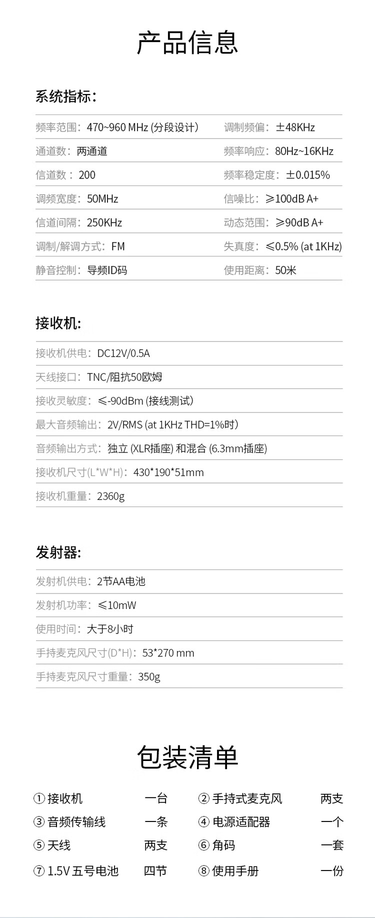 包装清单: • 接收机 一台 • 手持式麦克风 两支 • 音频传输线 一条 • 电源适配器 一个 • 天线 两支 • 角码 一套 • 1.5V 五号电池 四节 • 使用手册 一份