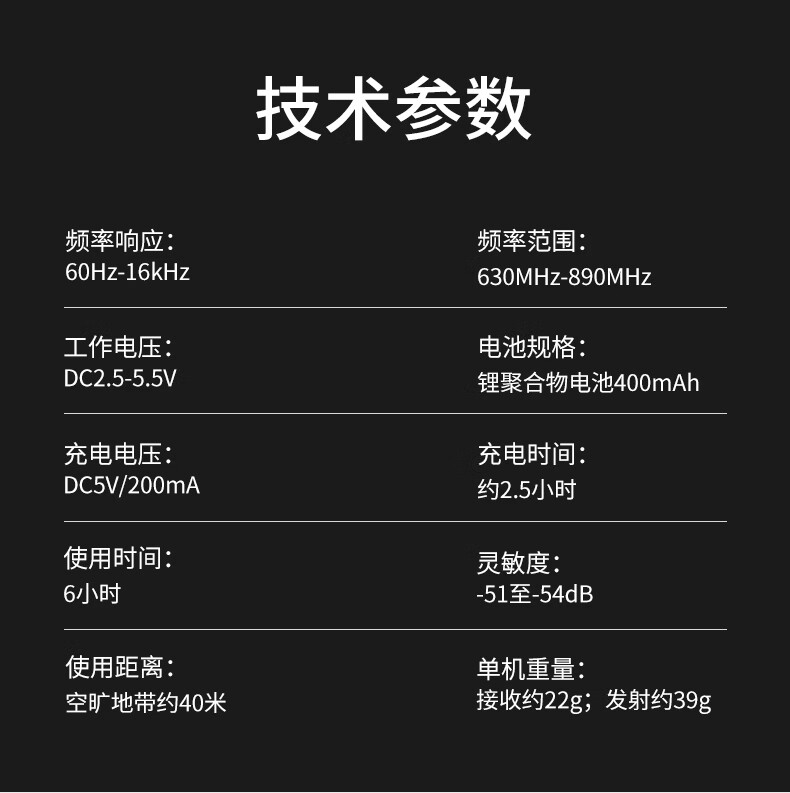 包装清单: • 头戴麦克风 1个 • 接收器 1个 • 充电线 1条 • 说明书 1份