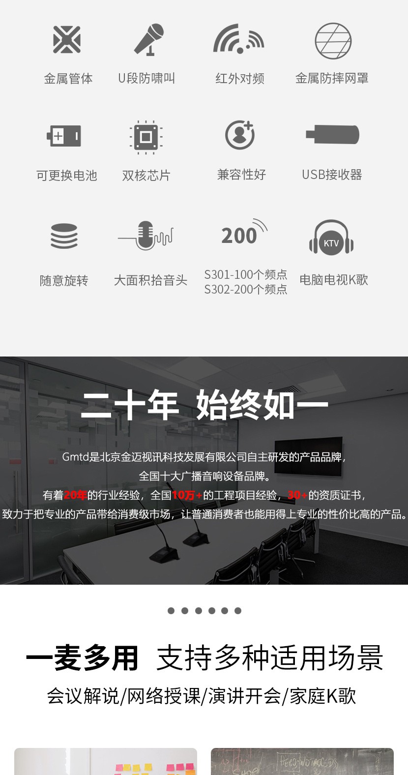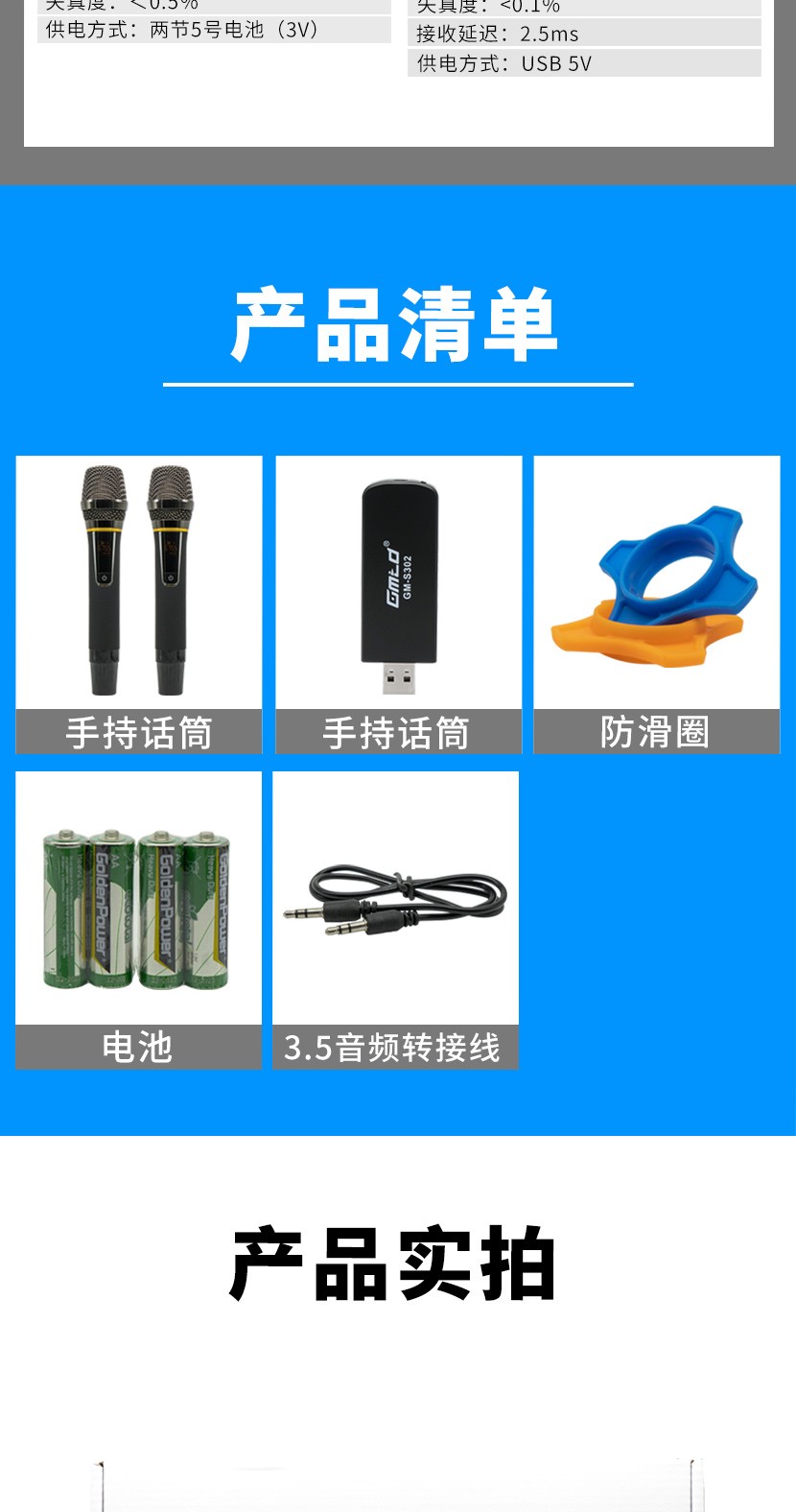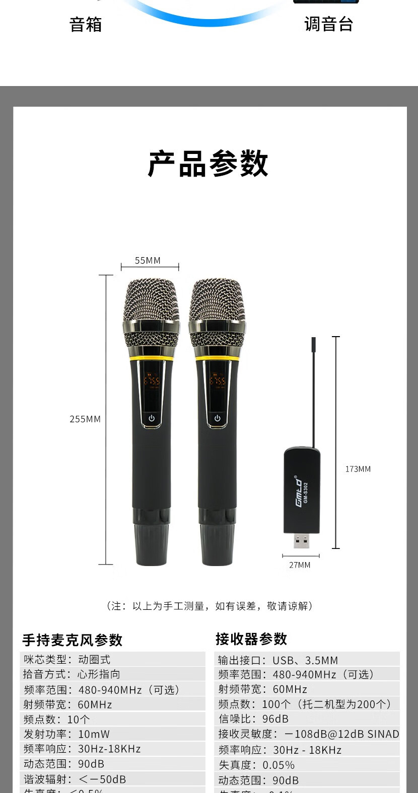 • 商品名称:Gmtd 金迈电脑USB无线麦克风手持话筒 笔记本电视教学演讲舞台家庭K歌会议麦克风 USB双手持GM-S302 麦克风/组