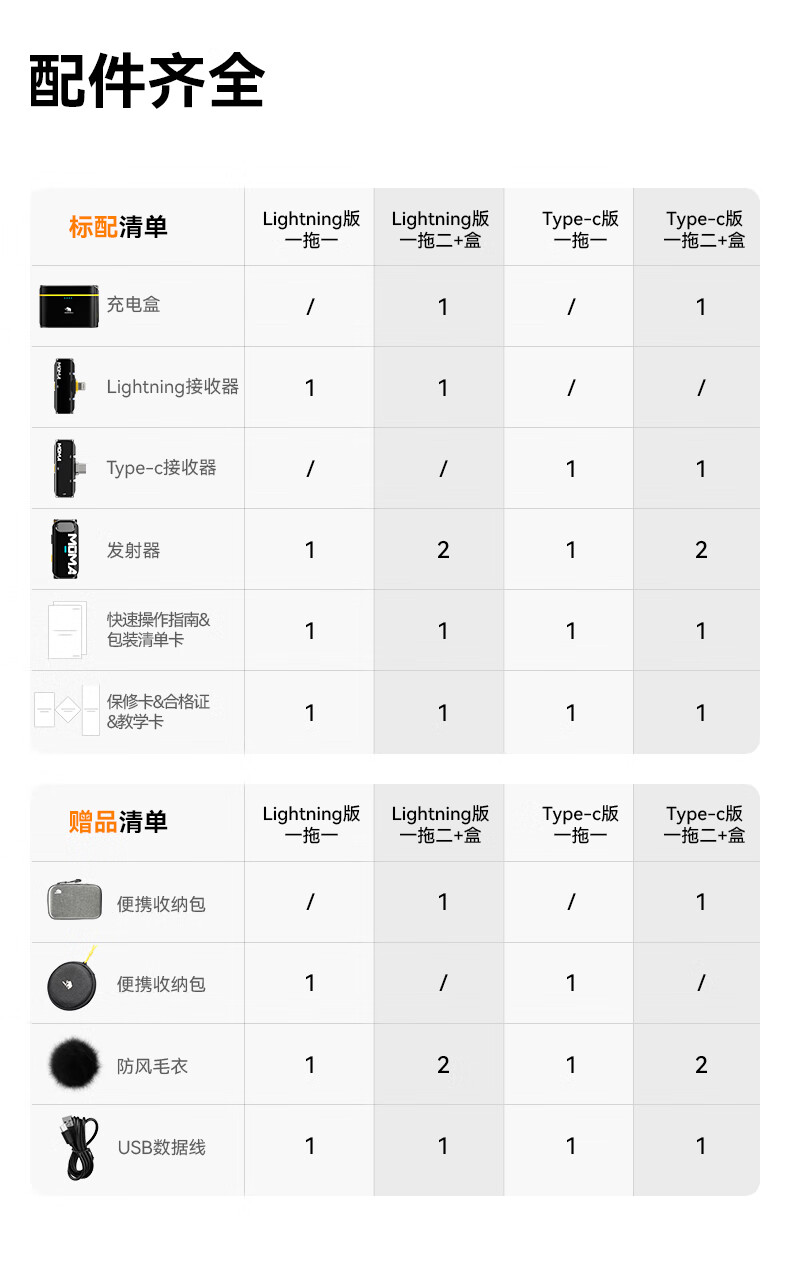包装清单: TX发射器*1、 RX接收器*1、 Type-A to Type-C充电线*1、 防风罩*1、 说明书*1、 保修卡*1、 收纳包*1