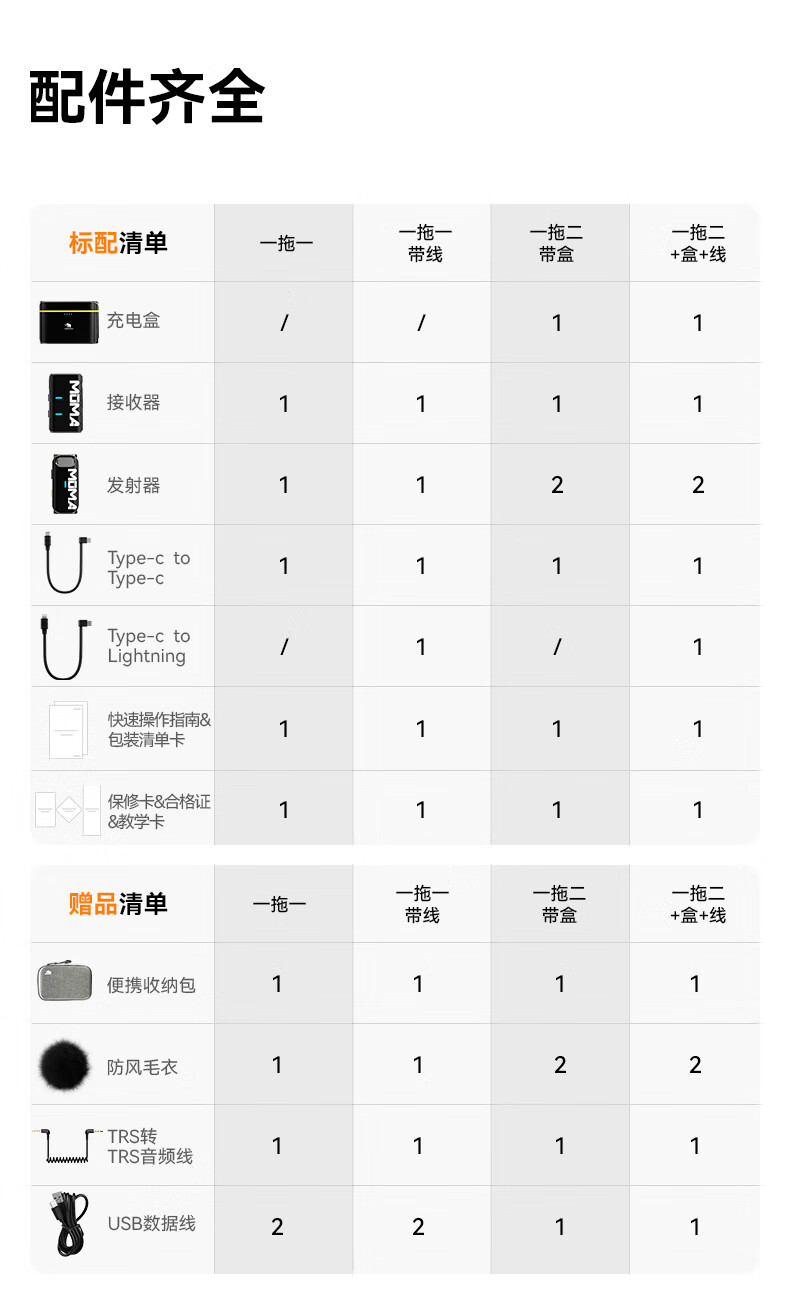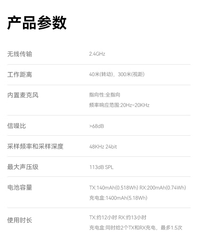 包装清单: 充电盒*1、 TX发射器*2、 RX接收器*1、 防风罩*2、 3.5mm TRS转3.5mm TRS音频线(相机)*1、Type-C转接线*1、Lightning转接线*1、USB充电线*1、 说明书*1、 保修卡*1、 收纳包*1