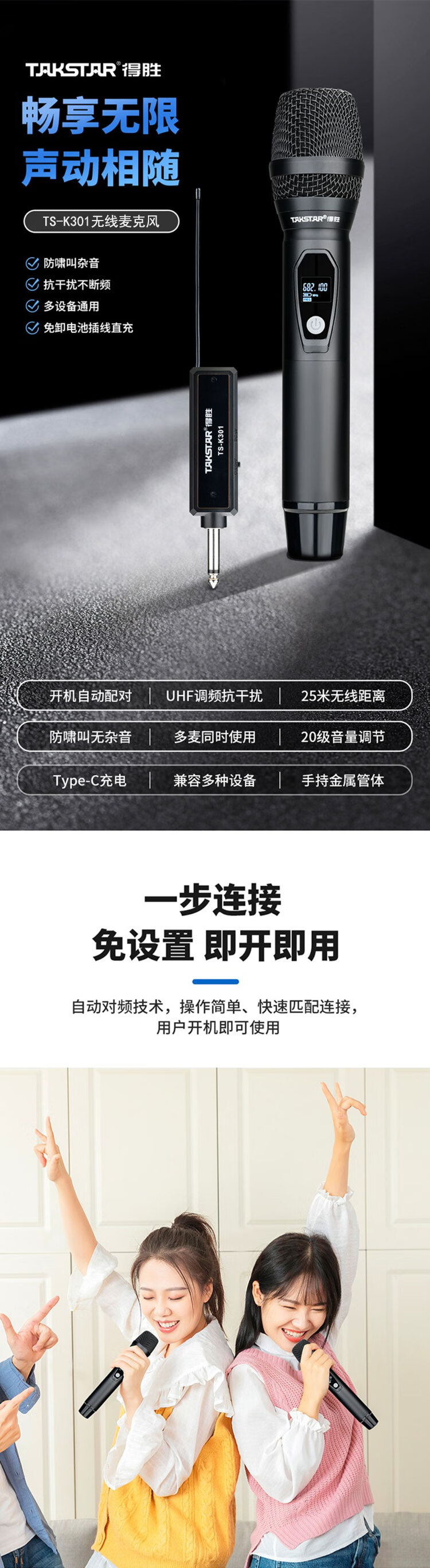 • 商品名称:得胜(TAKSTAR)TS-K301 无线一拖一麦克风 U段手持会议话筒 即插即用长续航 户外演唱直播主持家庭KTV TS-K301/套