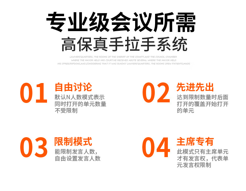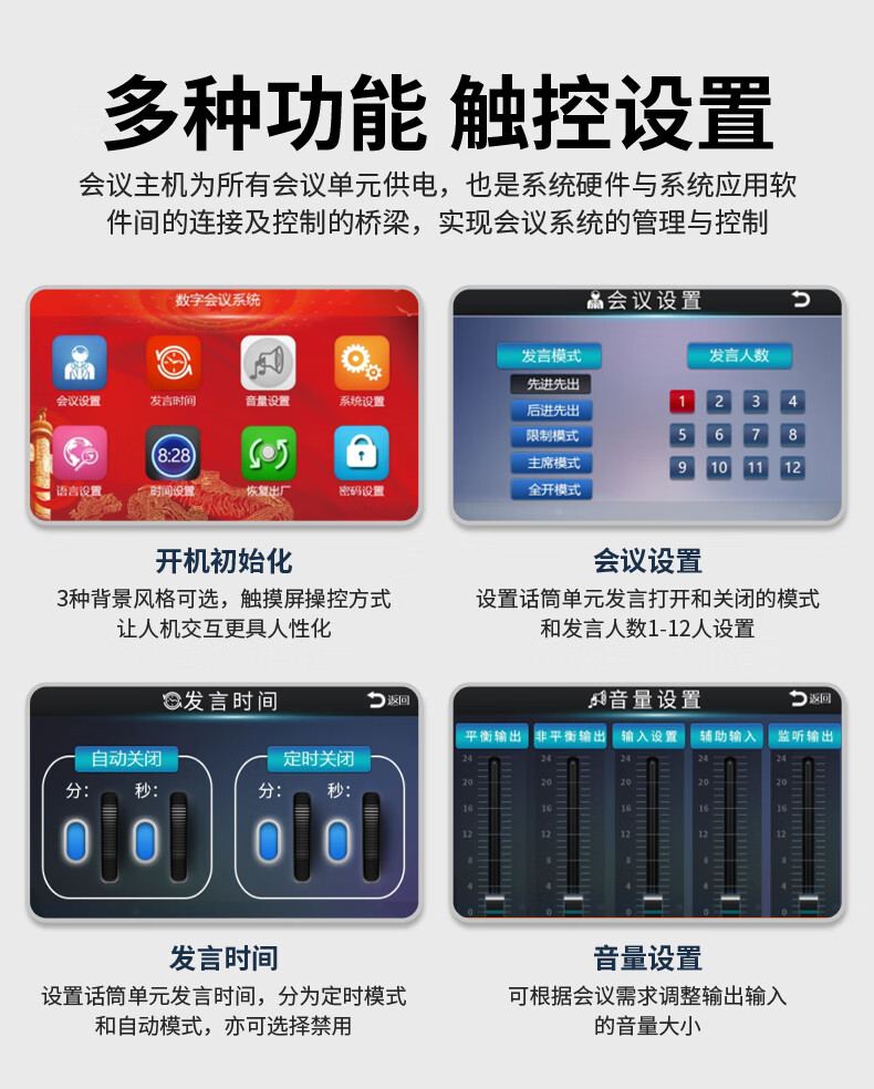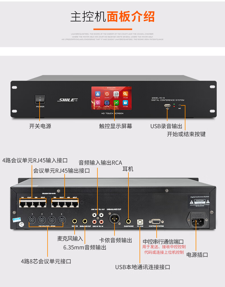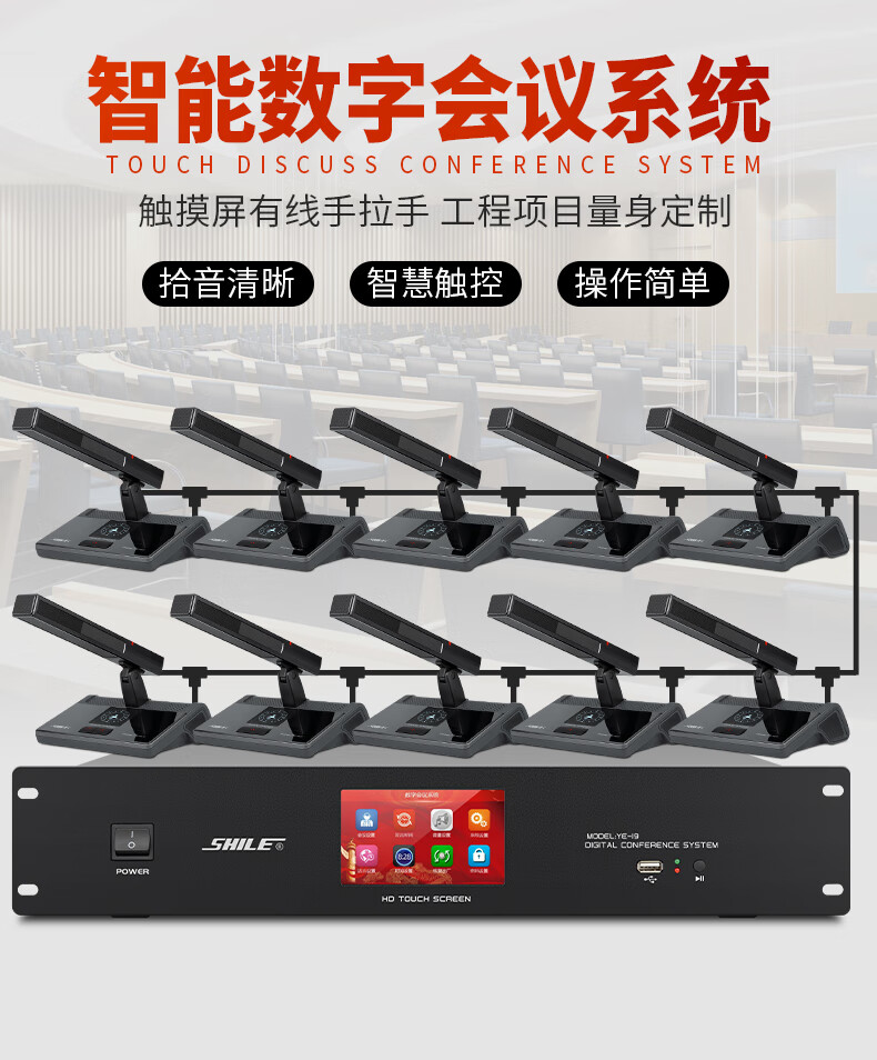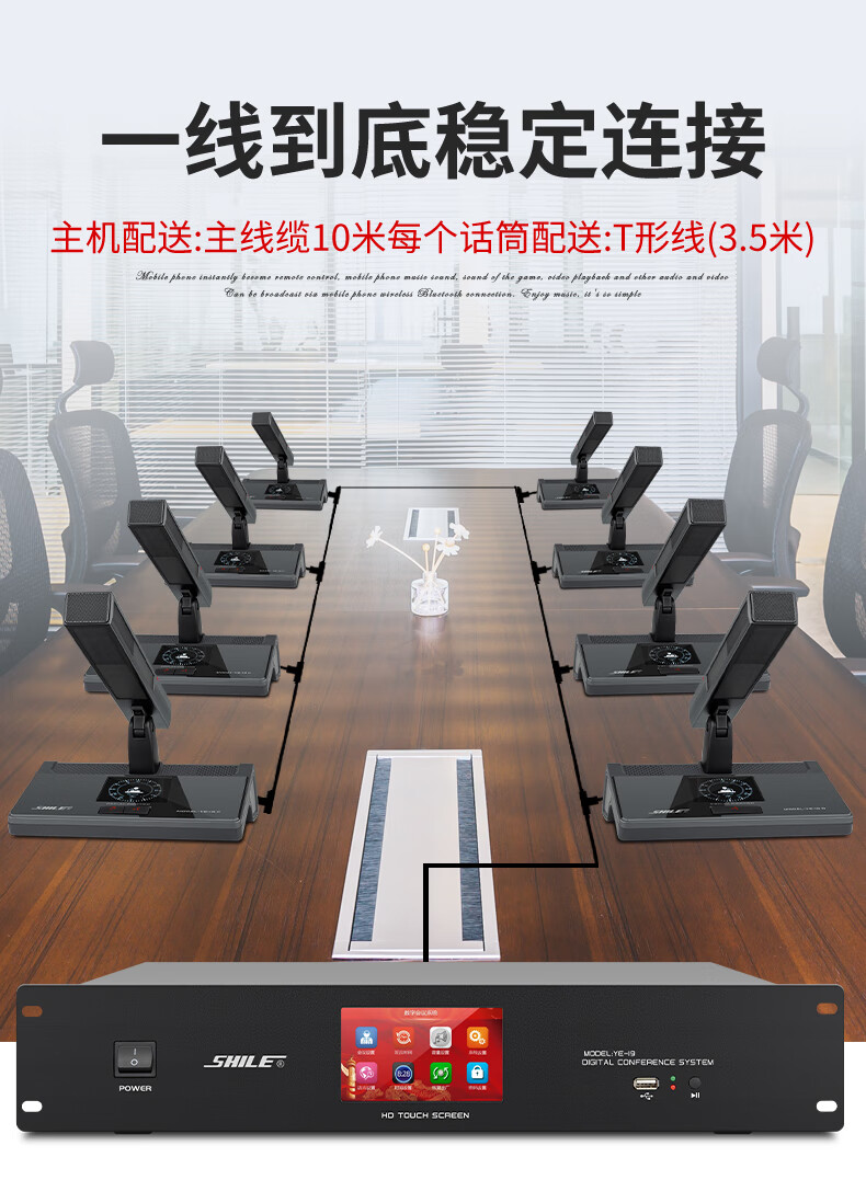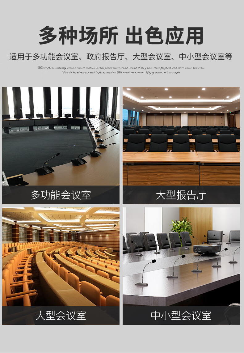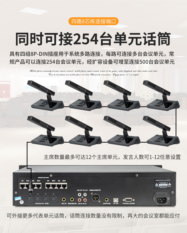 包装清单: 主机× 1、主席话筒× 1、代表话筒×7、电源线× 1、10米8芯线× 1、T型线× 8、6.5音频线× 1、说明书 × 1、保修卡 × 1;