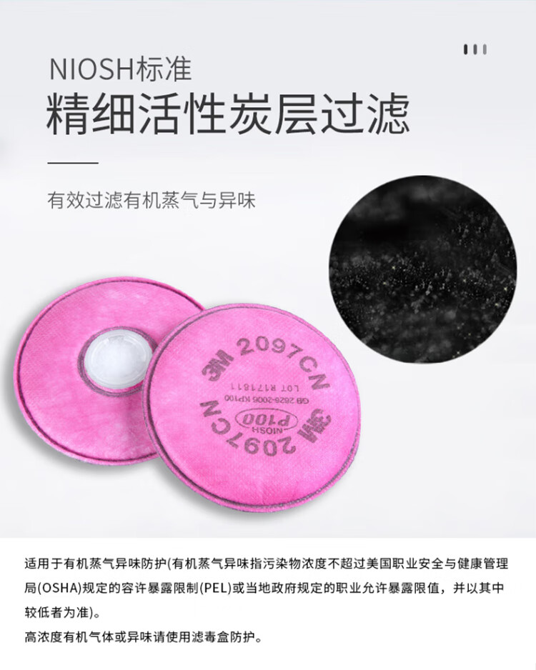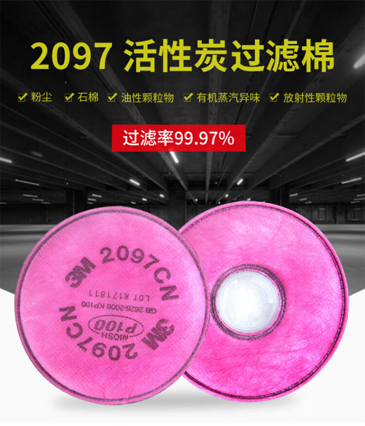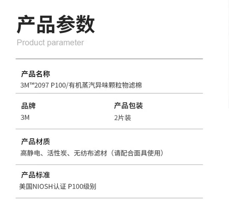 商品名称: 3M2097CN P100高效过滤棉防颗粒物有机蒸气喷漆 配面具用 2片/包CZ 滤棉系列/盒