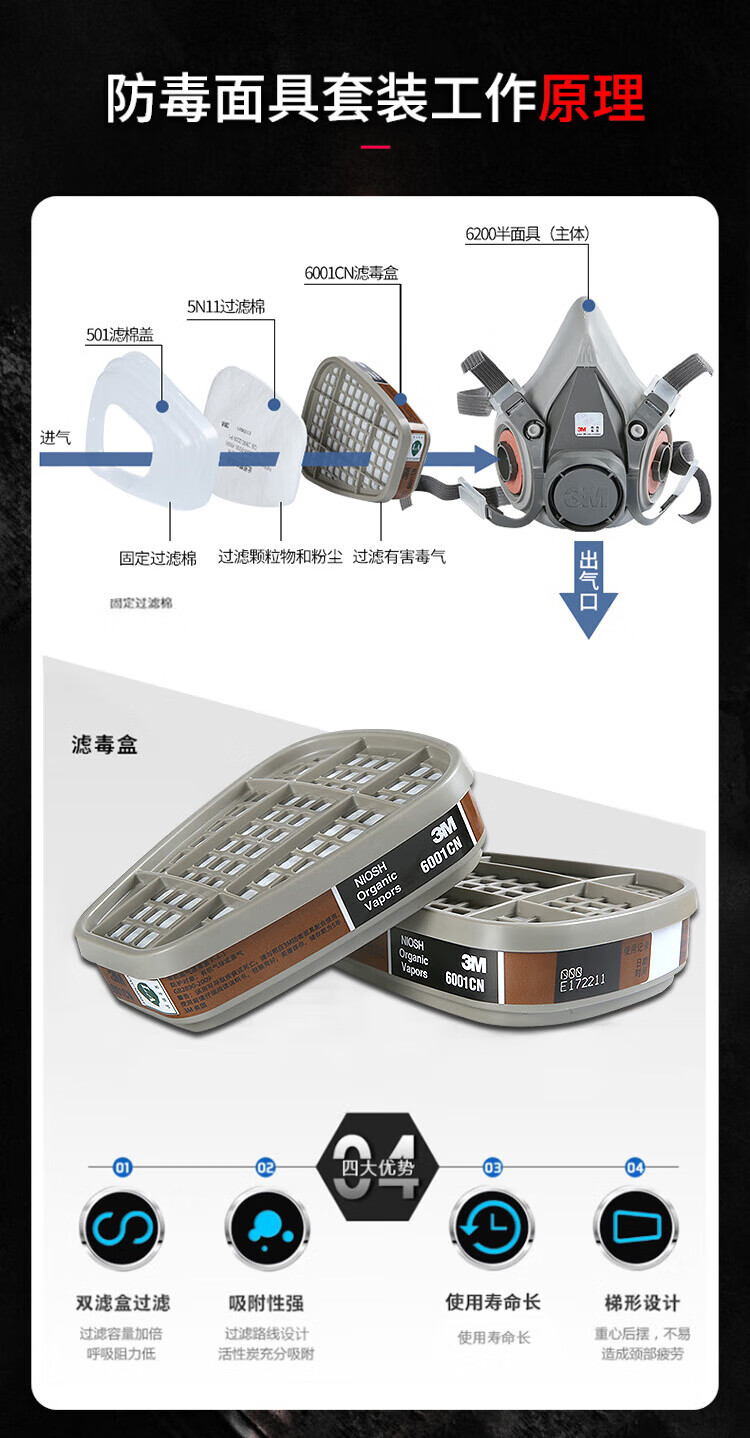 • 商品名称:3M6502+6005硅胶防毒面具罩实验室防有毒气体喷漆专用化工粉尘呼吸防护CZ 6800面具1个+6001CN滤毒盒2个+501滤棉盖2个+5N11CN滤棉2片/套