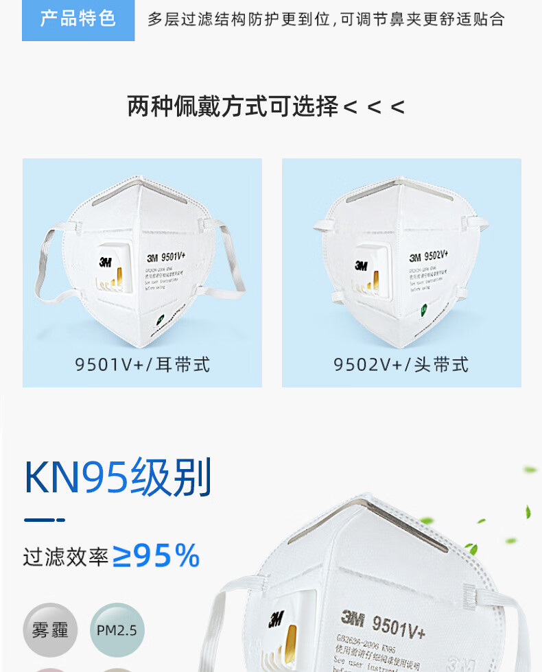 • 商品名称:3M 9501V+ 环保装防尘口罩 1个 SL 9501V+/个