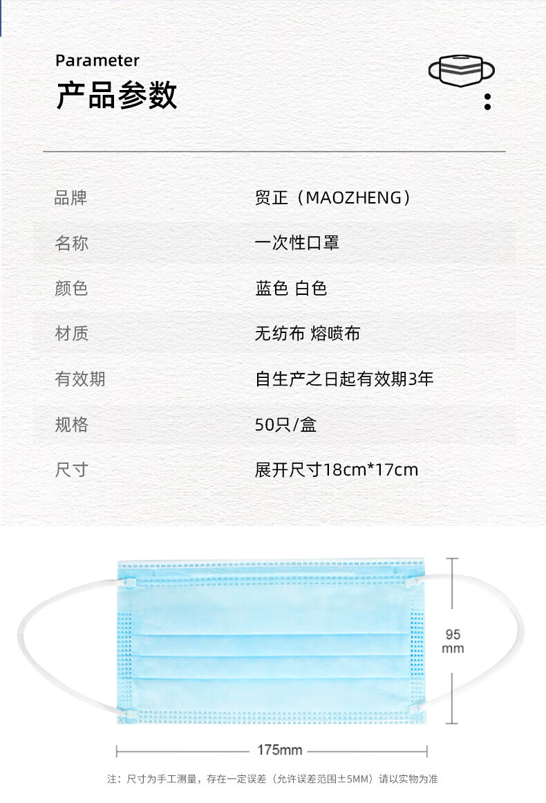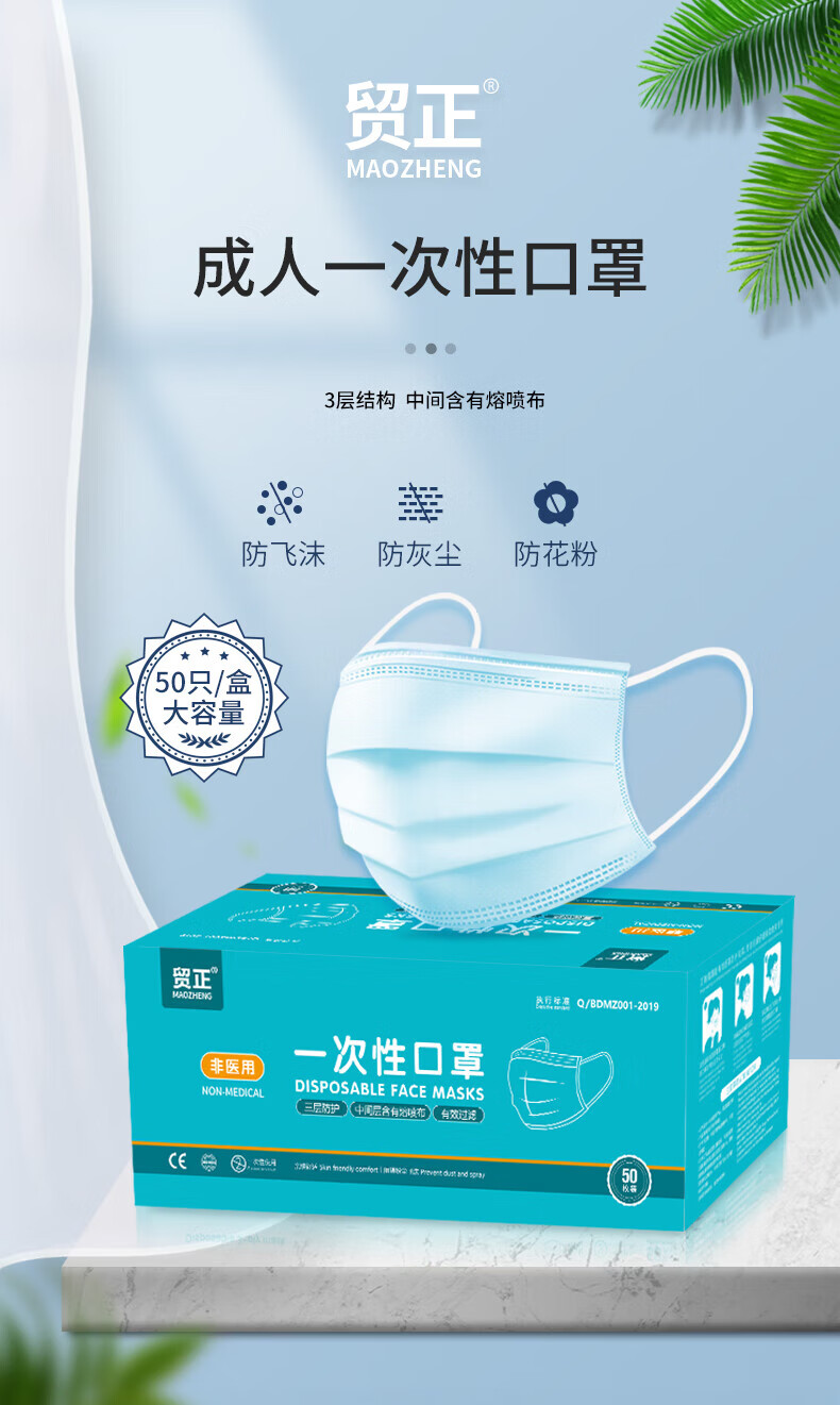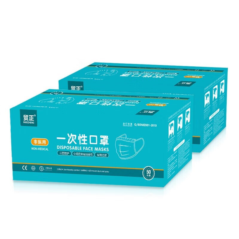 工业品  > 个人防护  > 呼吸防护  >  贸正/MaoZheng  >  贸正 一次性口罩 50只/盒蓝色带熔喷布三层成人男女通勤MZ-01 MZ-01/盒