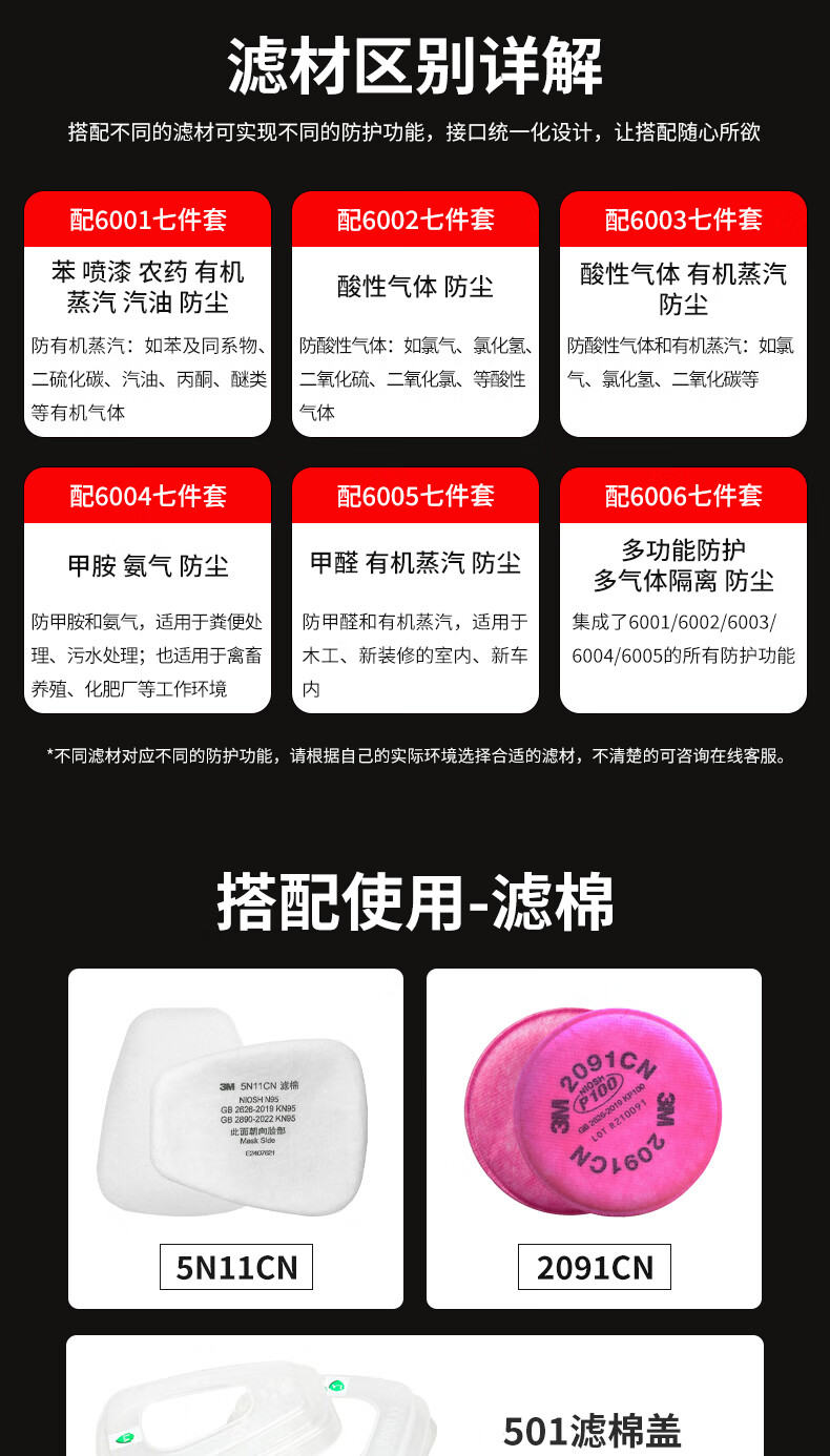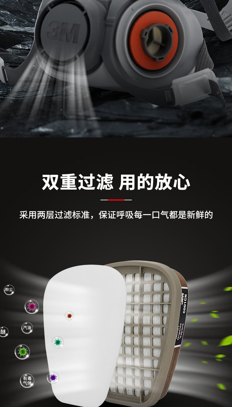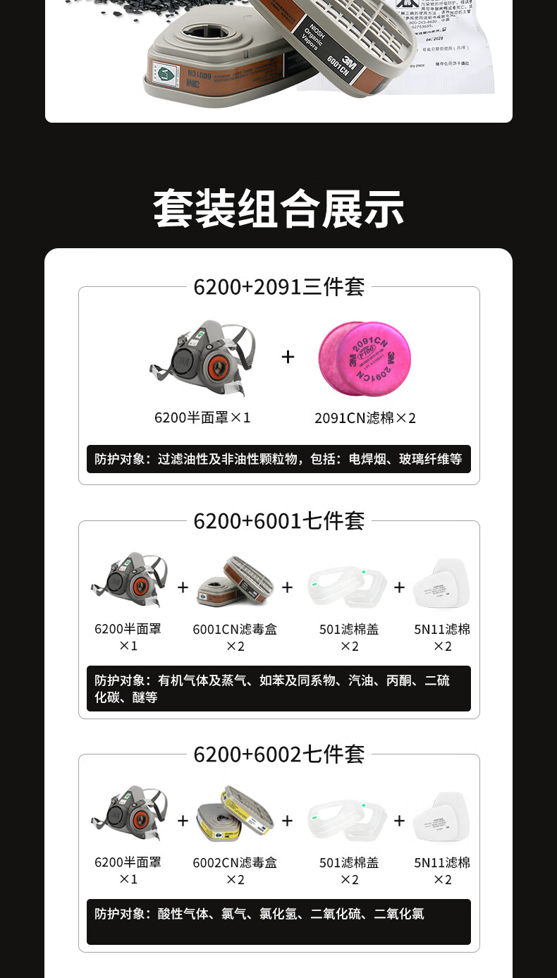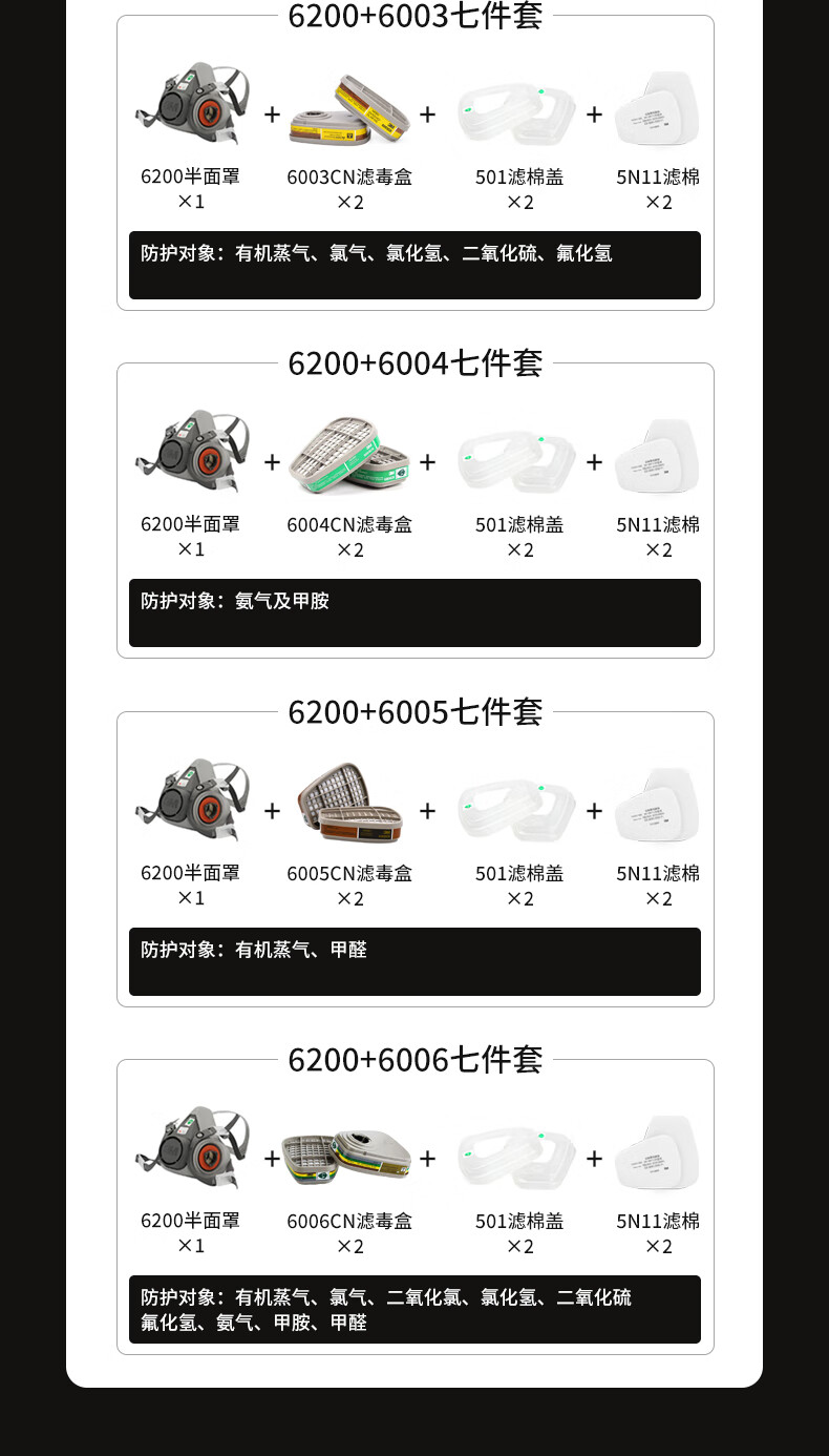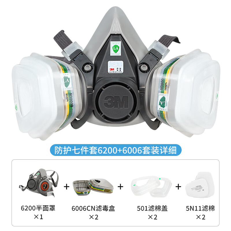 • 商品名称:3M防毒面具防甲醛防护有机气体等多种气体(6200+6006 七件套) 6200/个