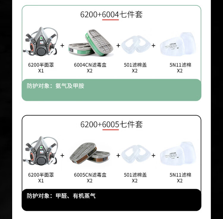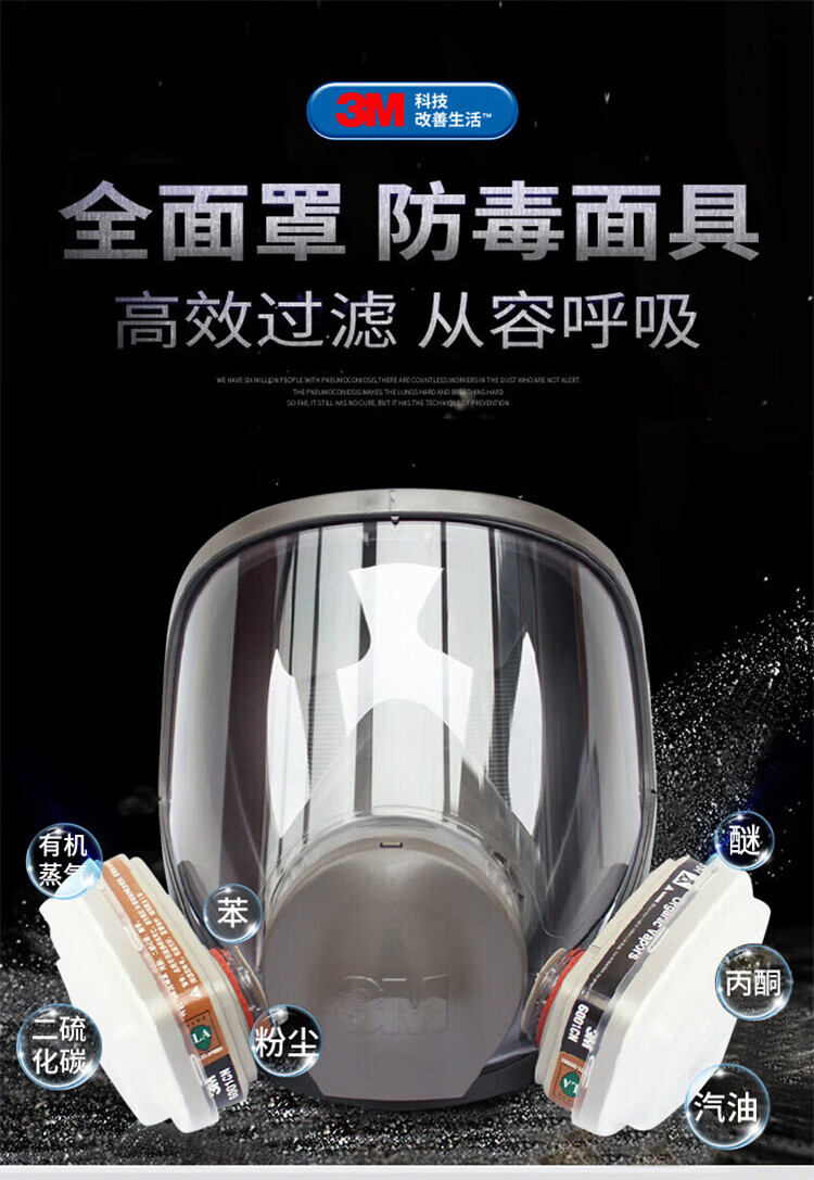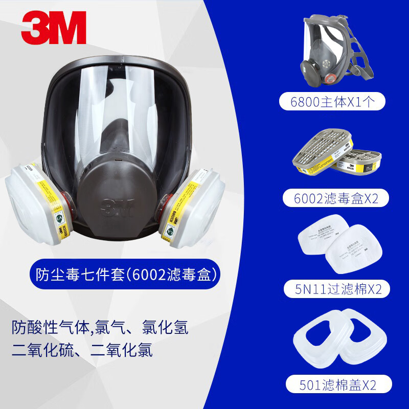 商品名称: 3M 6800+6002 防尘毒面罩 全面型防护面具 7件套防护套装防酸性气体CZ 6800面具1个+6001CN滤毒盒2个+501滤棉盖2个+5N11CN滤棉2片/套
