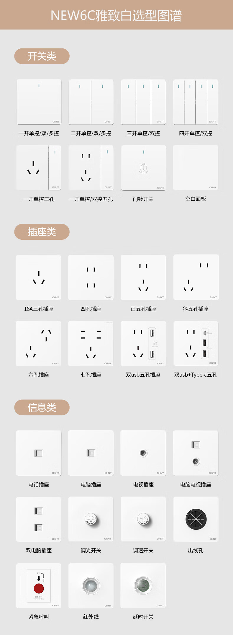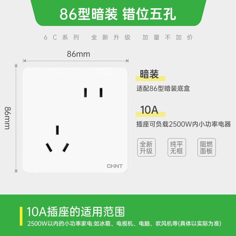 • 商品名称:正泰(CHNT)开关插座 10a斜五孔插座 86型暗装插座面板 6c奶油白 开关插座NEW6-C11130/个