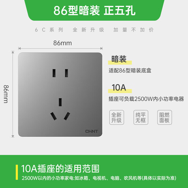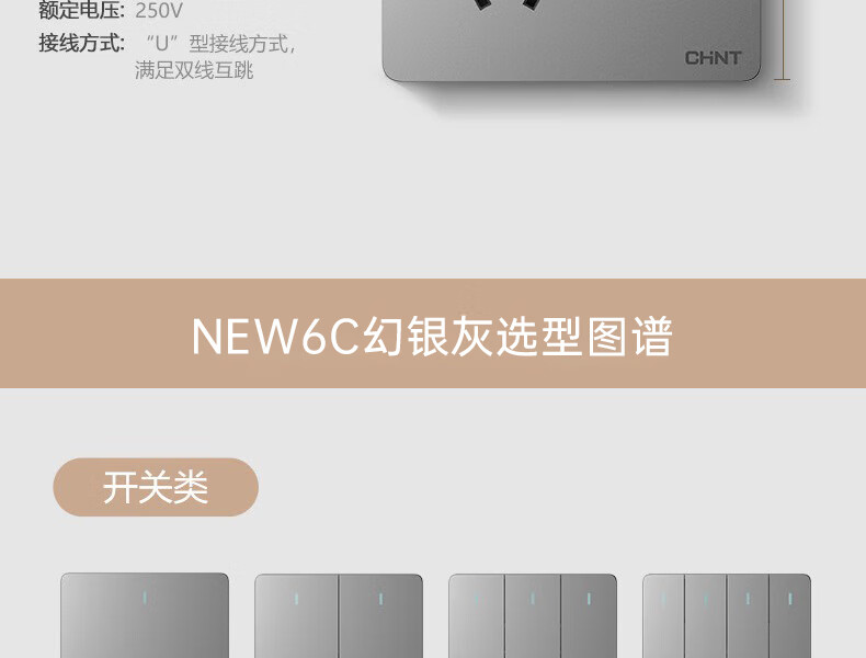 • 商品名称:正泰(CHNT)插座墙壁面板家用86型面板 五孔插座NEW6C幻银灰 开关插座NEW6-C11105/个
