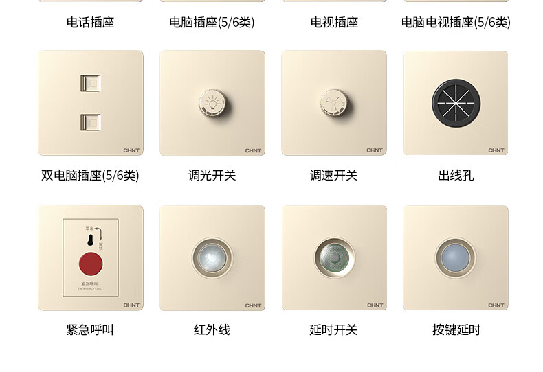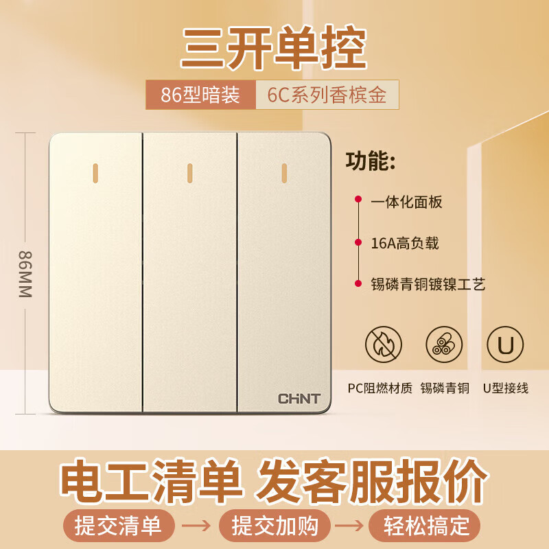 包装清单: 正泰(CHNT)开关插座墙壁面板家用86型面板三联单控开关NEW6C香槟金*1