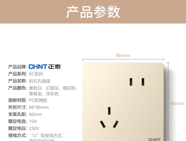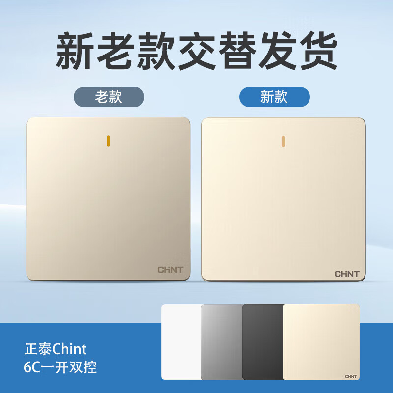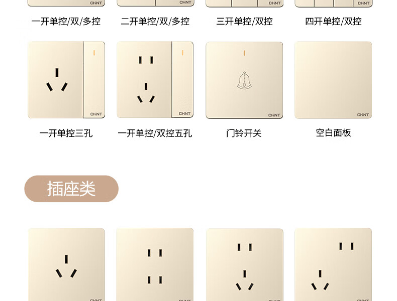 • 商品名称:正泰(CHNT)开关插座墙壁面板家用86型面板一联双控开关NEW6C香槟金 开关插座NEW6-C00202/个