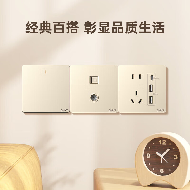 包装清单: 正泰(CHNT)开关插座墙壁面板家用86型面板一联二极三极 斜五孔插座NEW6C香槟金十只装*1
