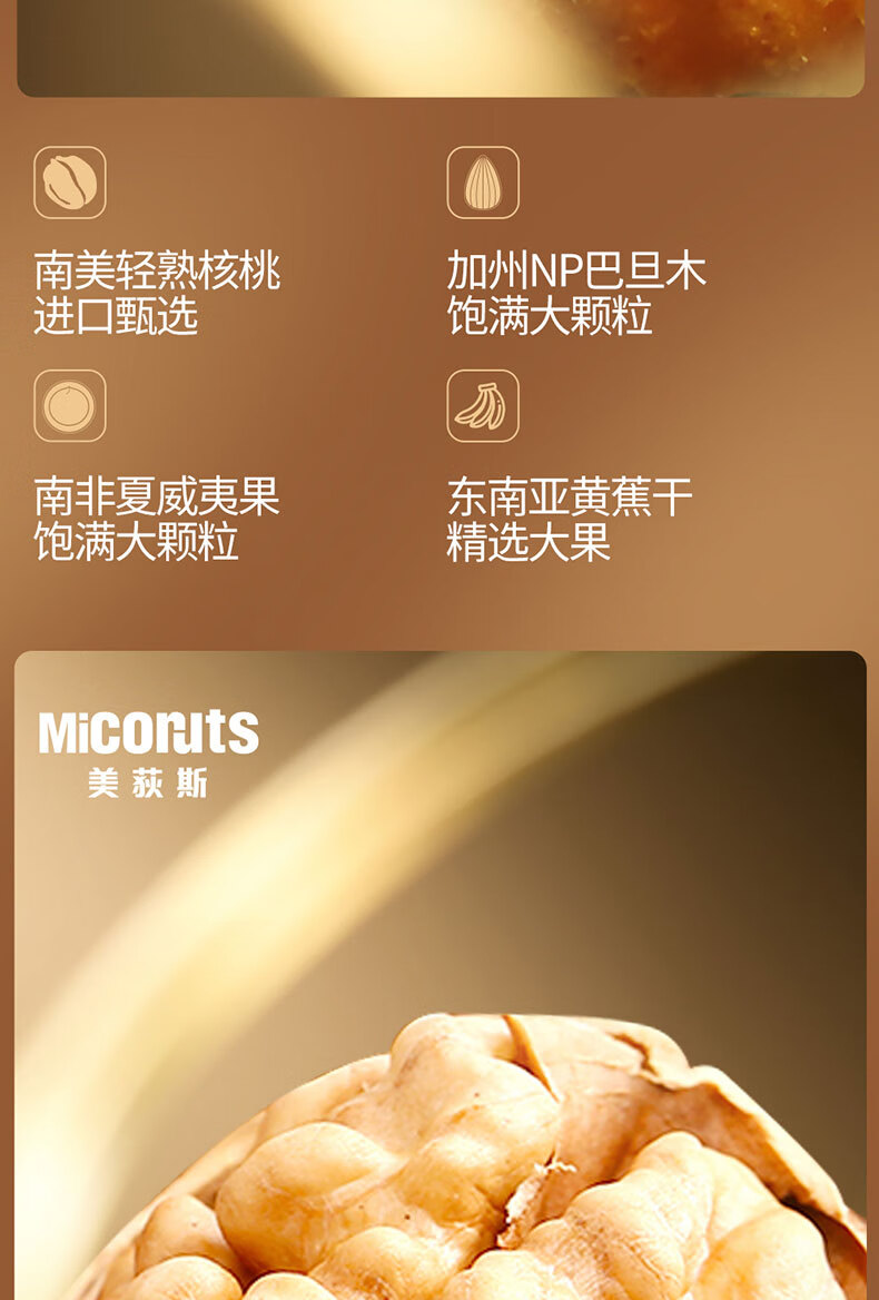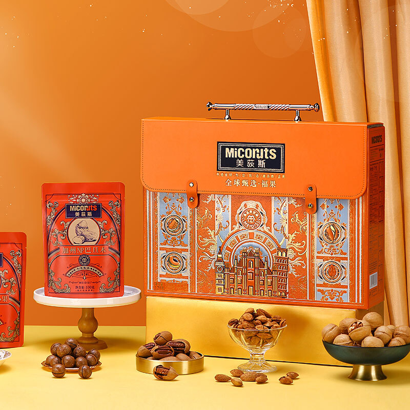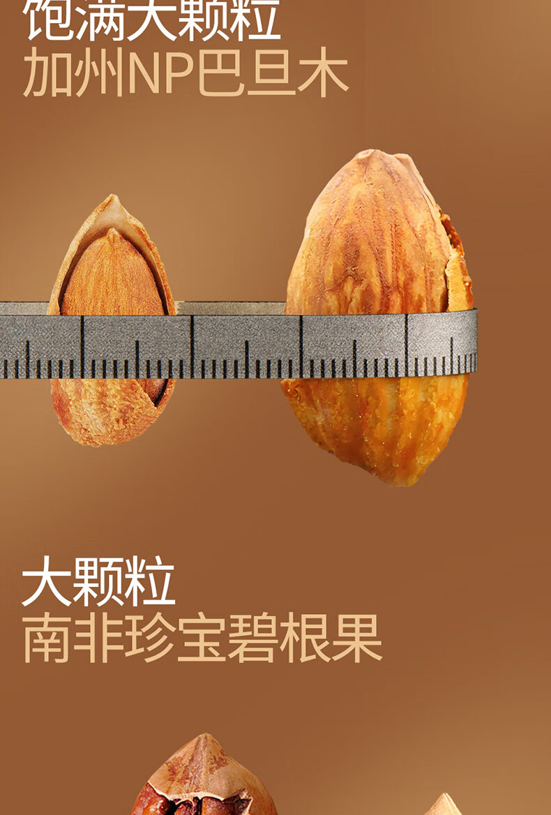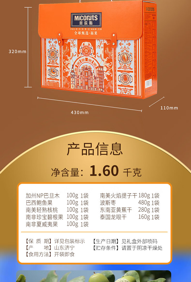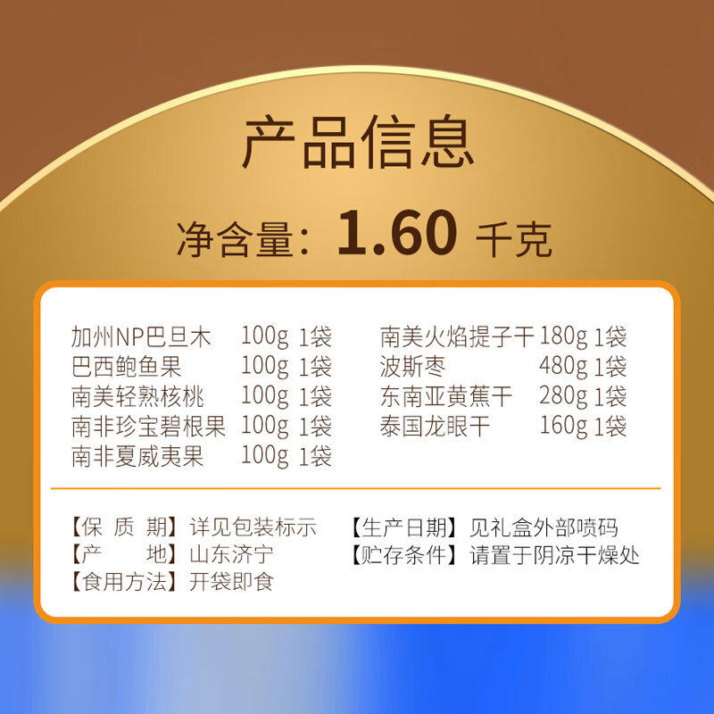 包装清单: 加州NP巴旦木100g*1 巴西鲍鱼果100g*1 南非珍宝碧根果100g*1 南非夏威夷果100g*1 南美轻熟核桃100g*1 南美火焰提子干180g*1 波斯枣480g*1 东南亚黄蕉干280g*1 泰国龙眼干160g*1