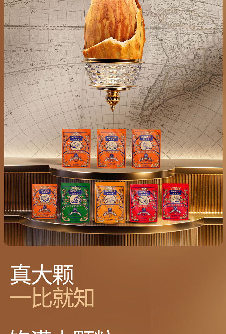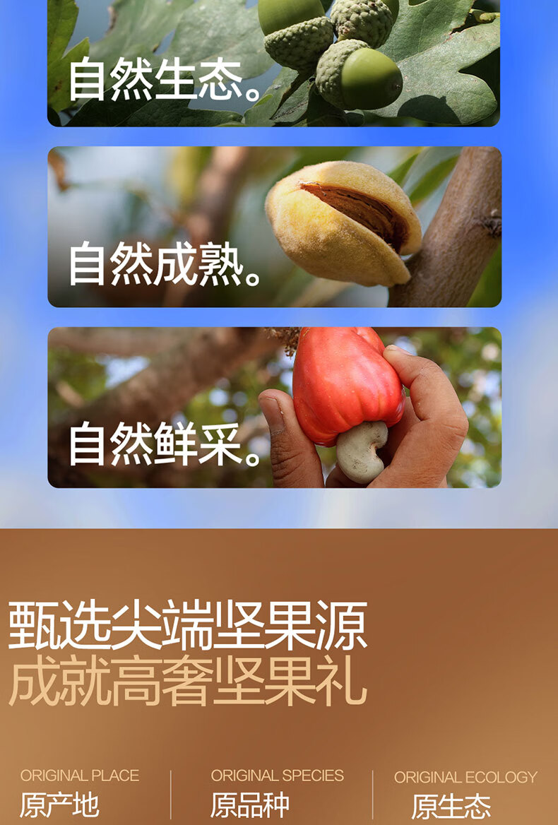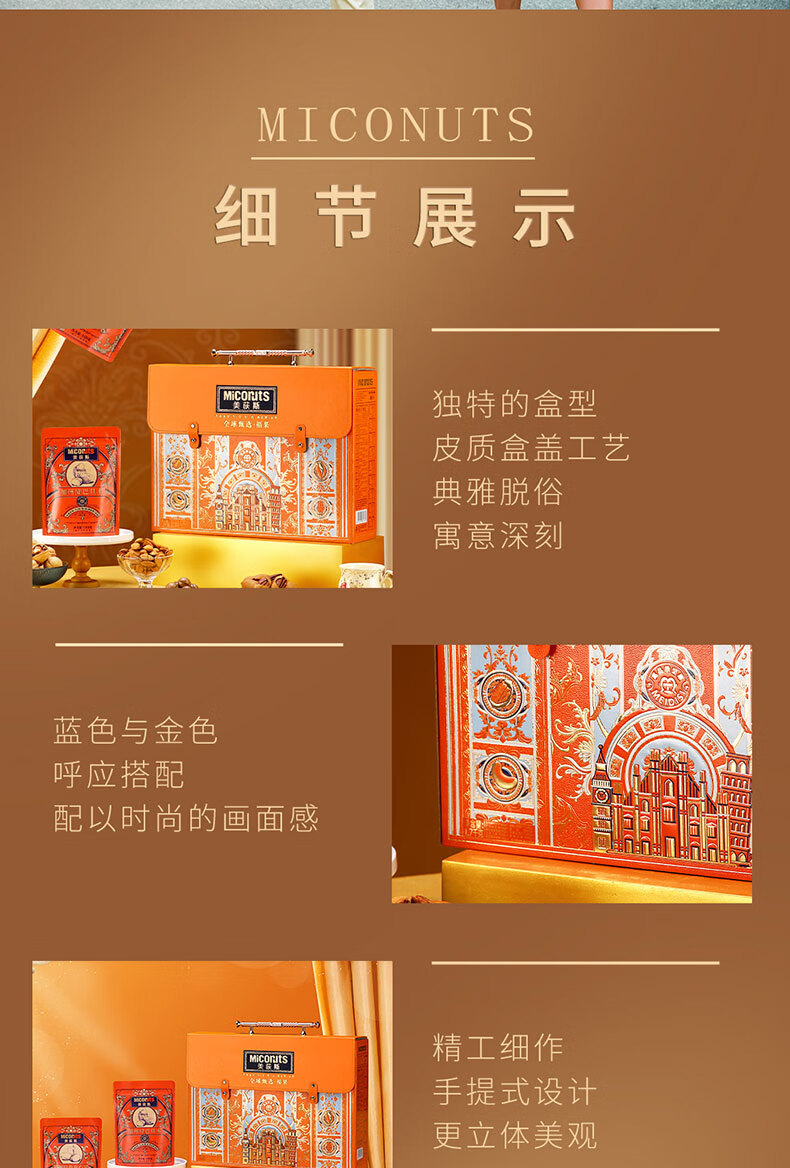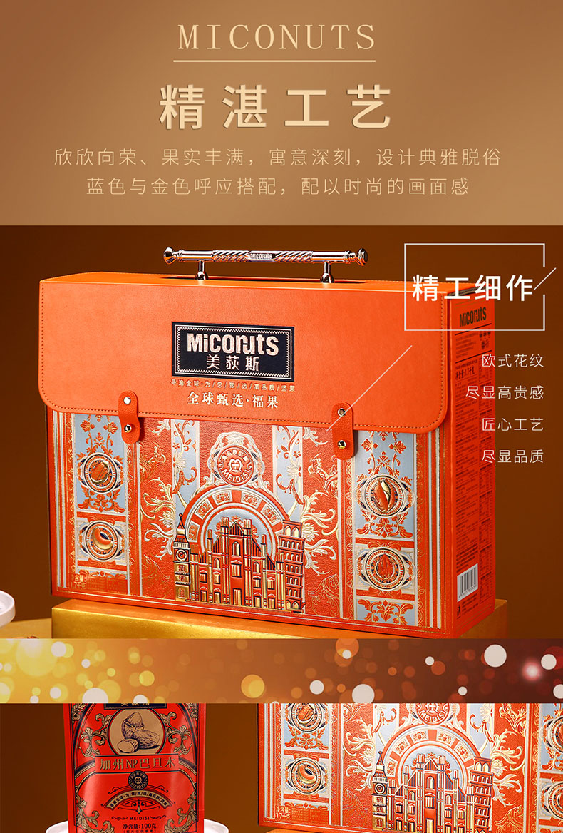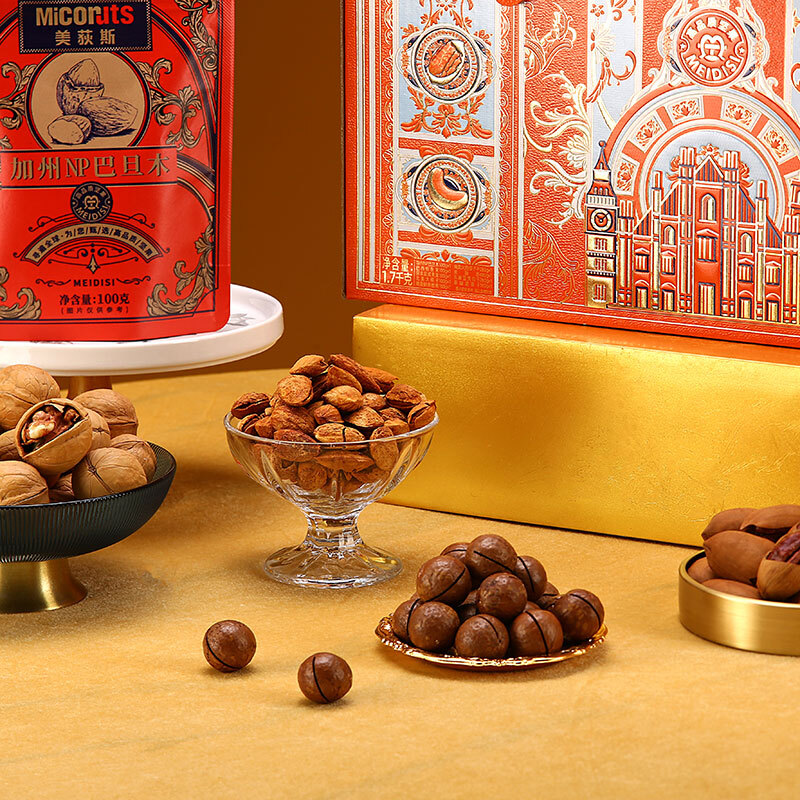 包装清单: 加州NP巴旦木100g*1 巴西鲍鱼果100g*1 南非珍宝碧根果100g*1 南非夏威夷果100g*1 南美轻熟核桃100g*1 南美火焰提子干180g*1 波斯枣480g*1 东南亚黄蕉干280g*1 泰国龙眼干160g*1