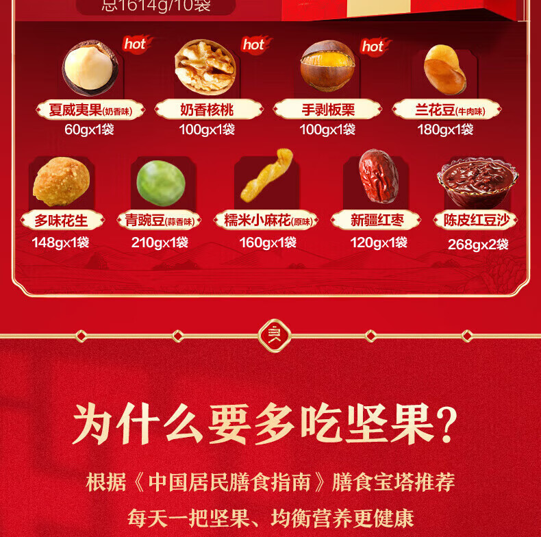 商品名称: 良品铺子 坚果礼盒1614g 夏威夷果核桃每日坚果零食大礼包 团购超值福利 大吉大粒1614g/个