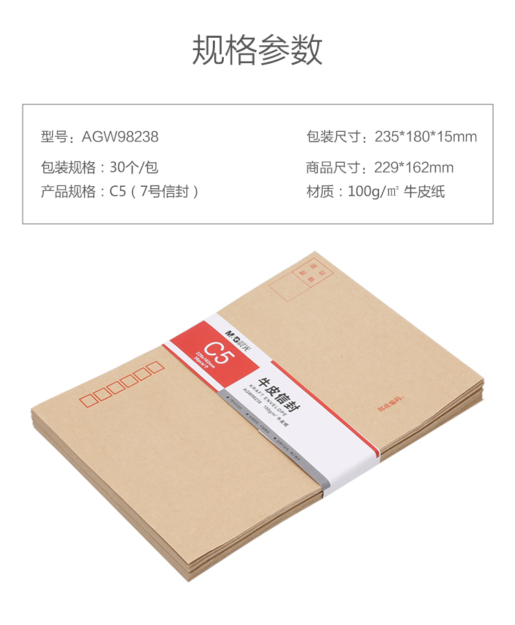 • 商品名称:晨光(M&G)7号C5牛皮纸信封 229*162mm办公专用发票袋 商务邮局标准信封袋工资袋 30个装AGW98238 新老款随机 AGW98238/袋