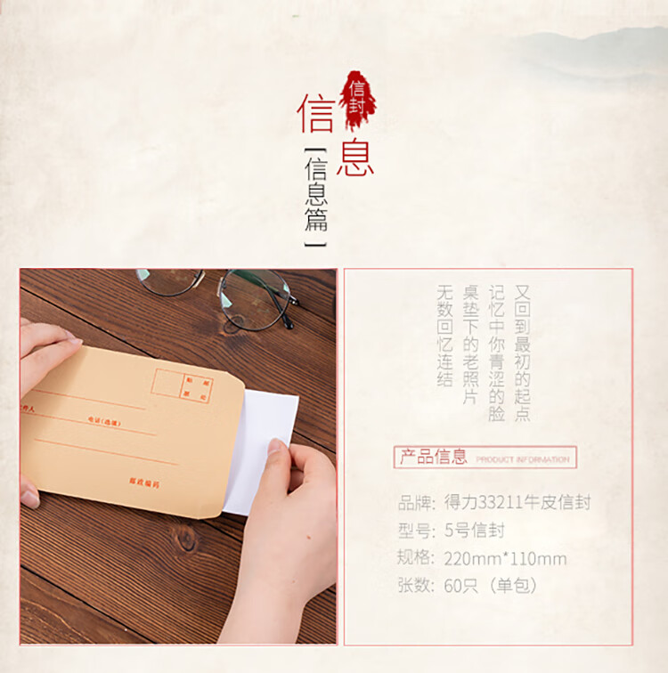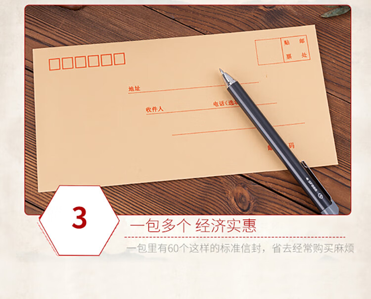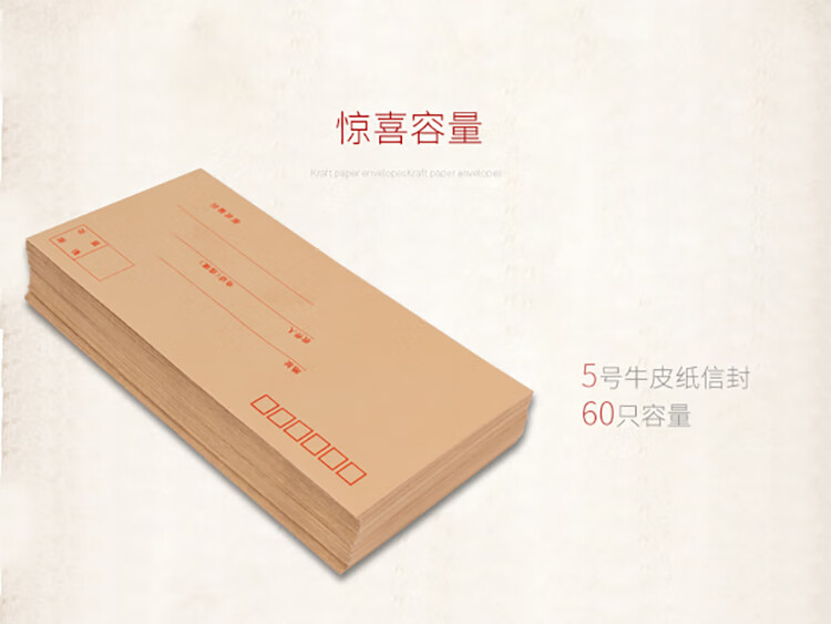 • 商品名称:得力(deli)60个装5号牛皮纸信封 220*110mm发票袋 邮局标准信封袋工资袋 33211 33211/包