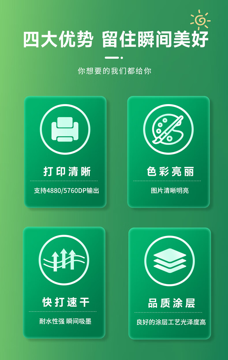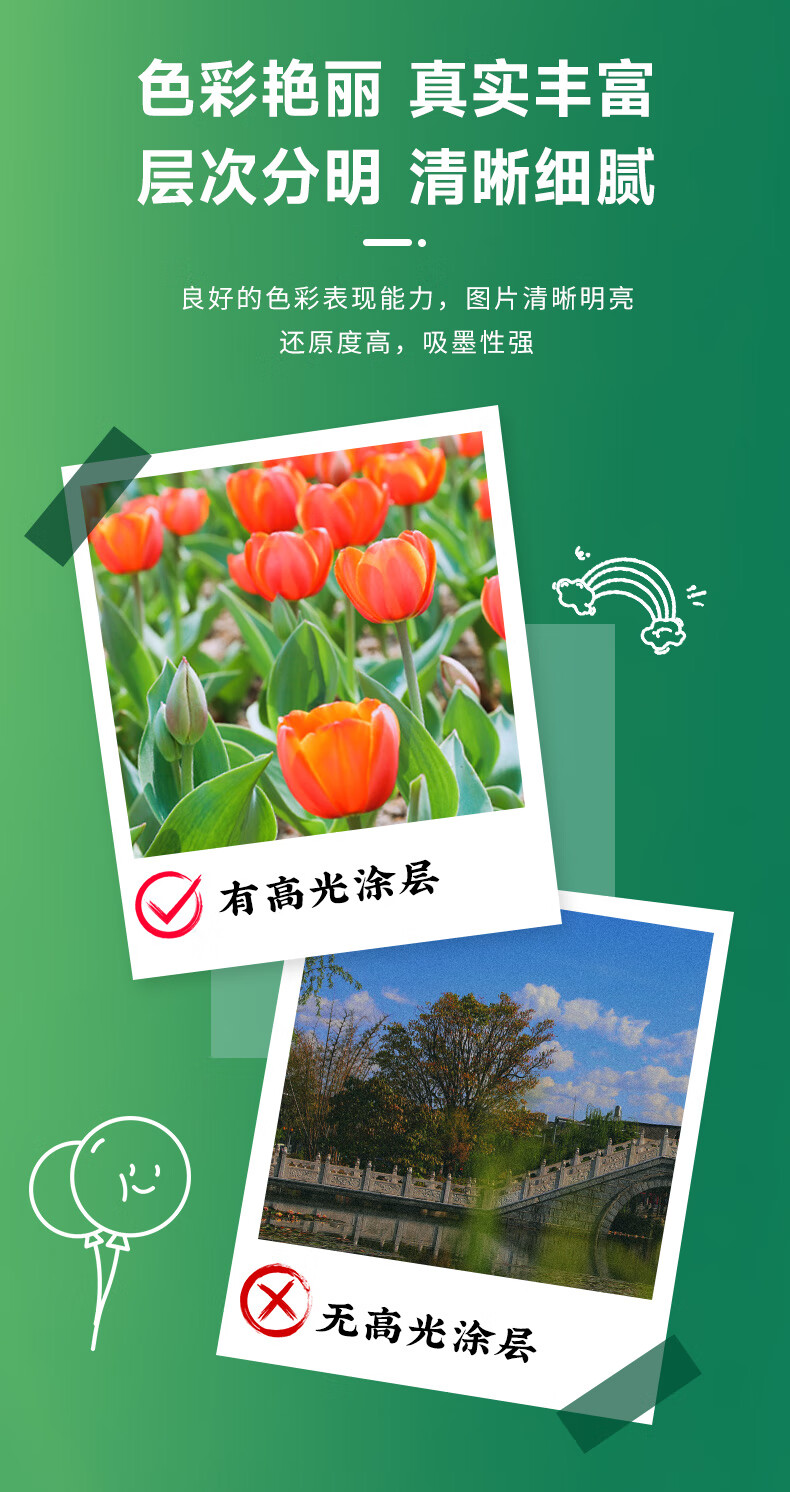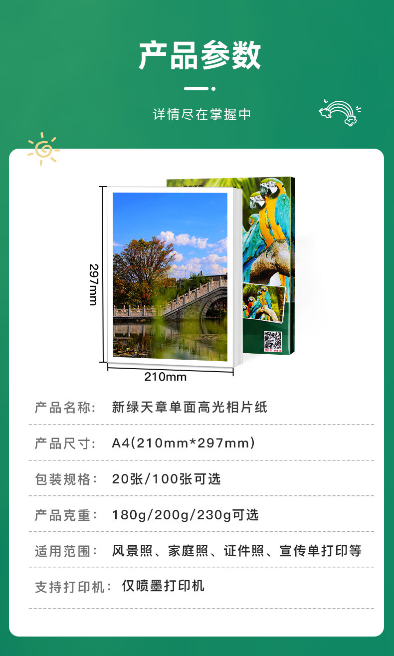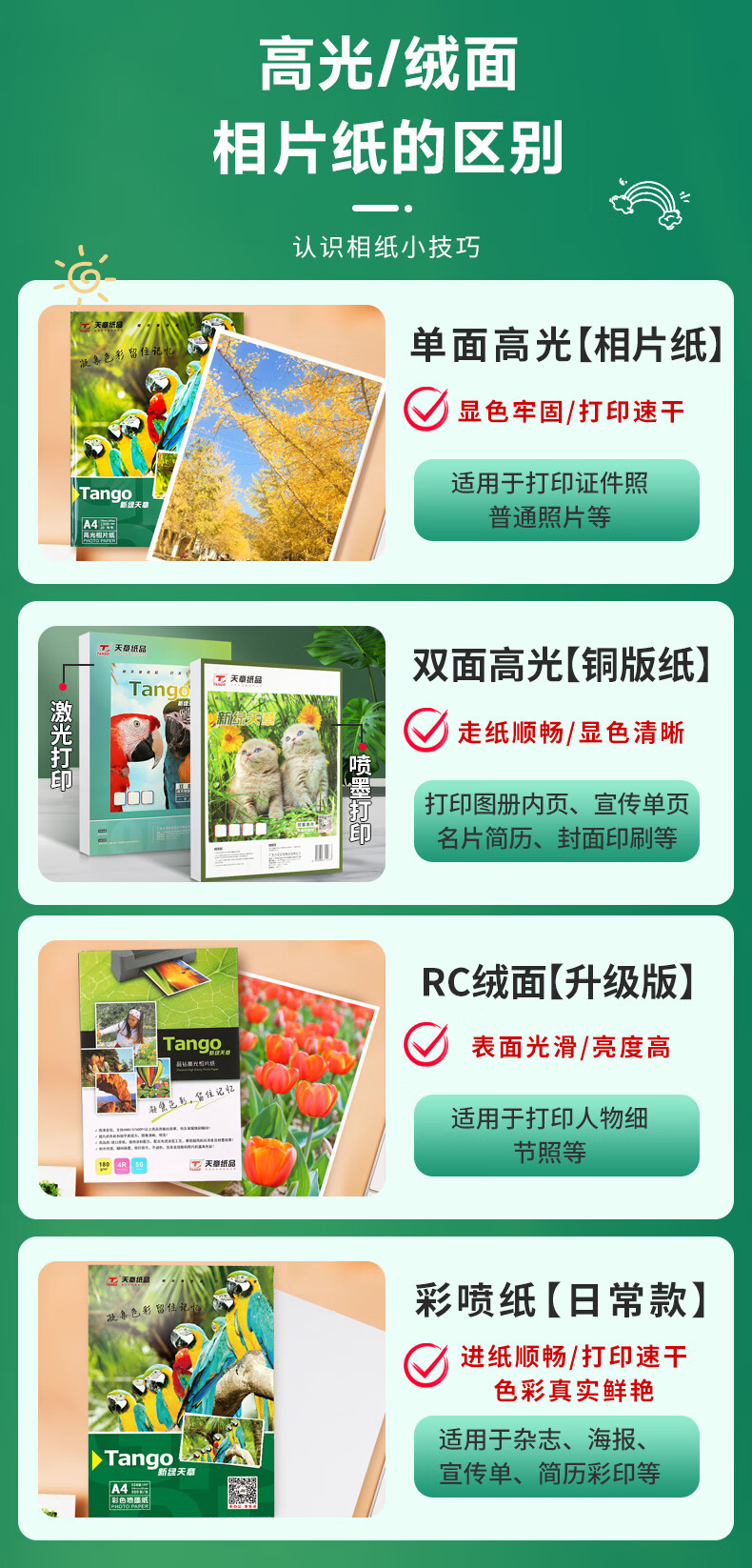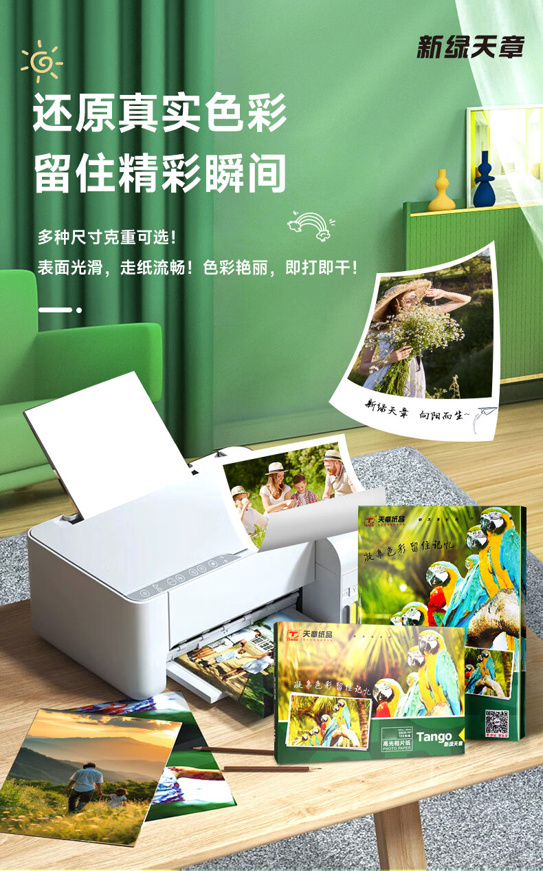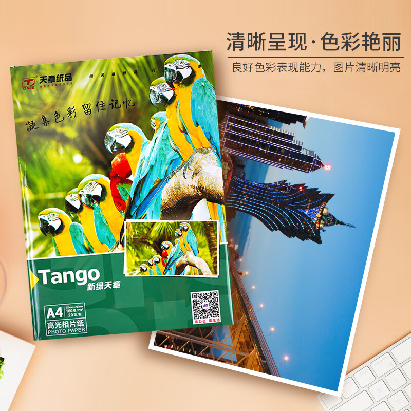• 商品名称:天章 (TANGO)A4相纸180g 单面高光相片纸 名片定制打印相片 彩色照片打印纸 a4喷墨证件照打印机照相纸 20张/包 多彩天章 新绿A4 180G 高光相片纸/包