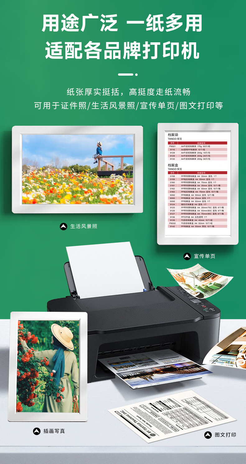 商品名称: 天章 (TANGO)A4相纸180g 单面高光相片纸 名片定制打印相片 彩色照片打印纸 a4喷墨证件照打印机照相纸 20张/包 多彩天章 新绿A4 180G 高光相片纸/包