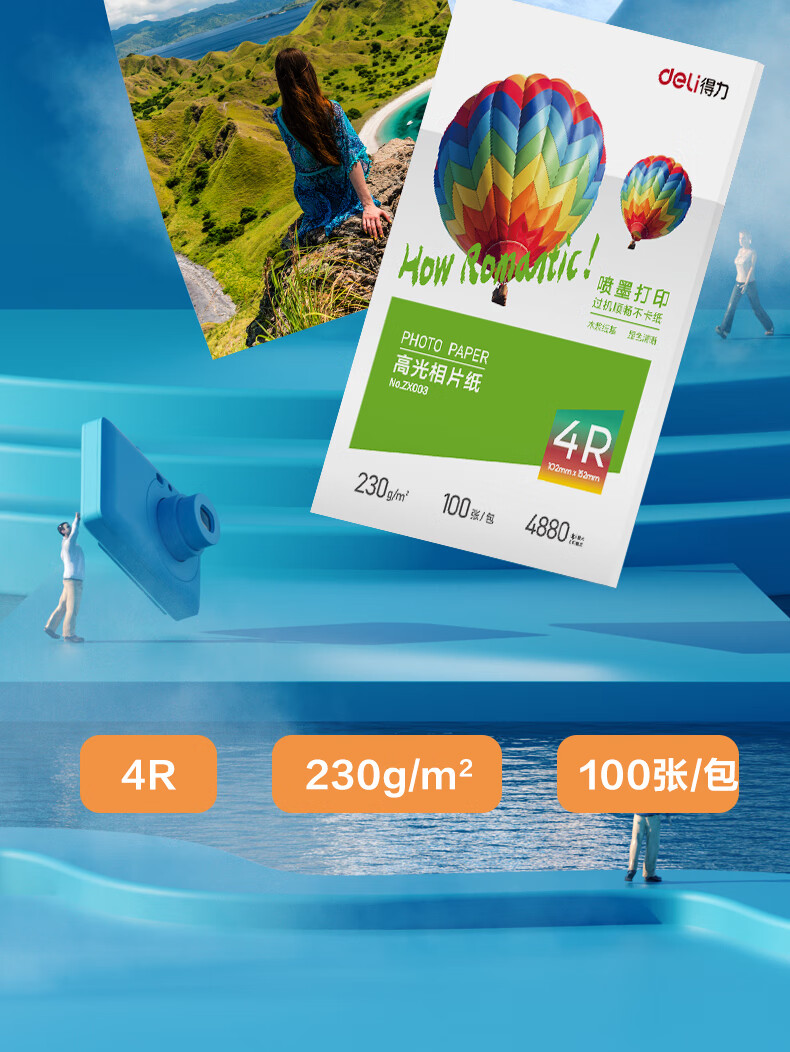 得力(deli)6英寸 230g高光相纸 彩色喷墨照片打印纸 高光泽相片纸 100张/盒 ZX003 ZX003/包