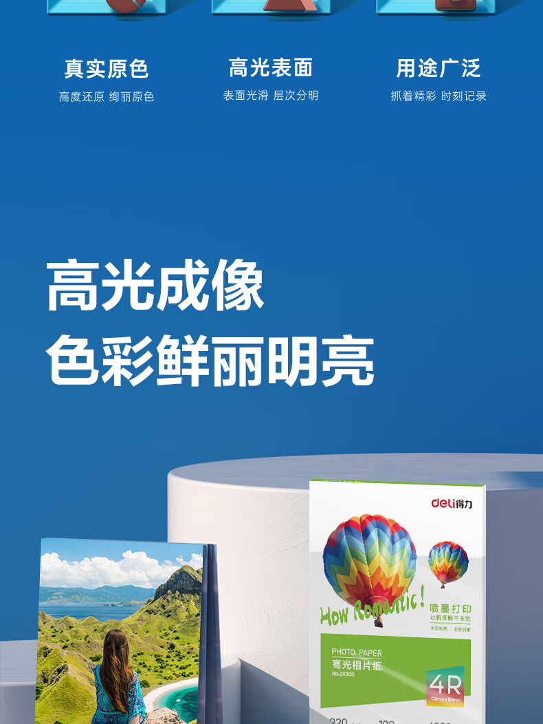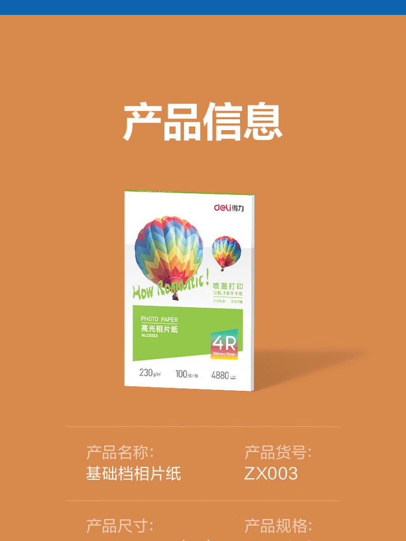 • 商品名称:得力(deli)6英寸 230g高光相纸 彩色喷墨照片打印纸 高光泽相片纸 100张/盒 ZX003 ZX003/包