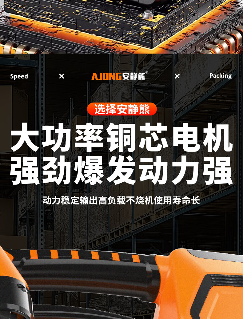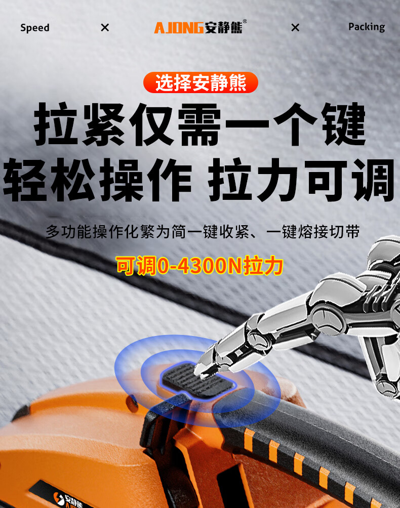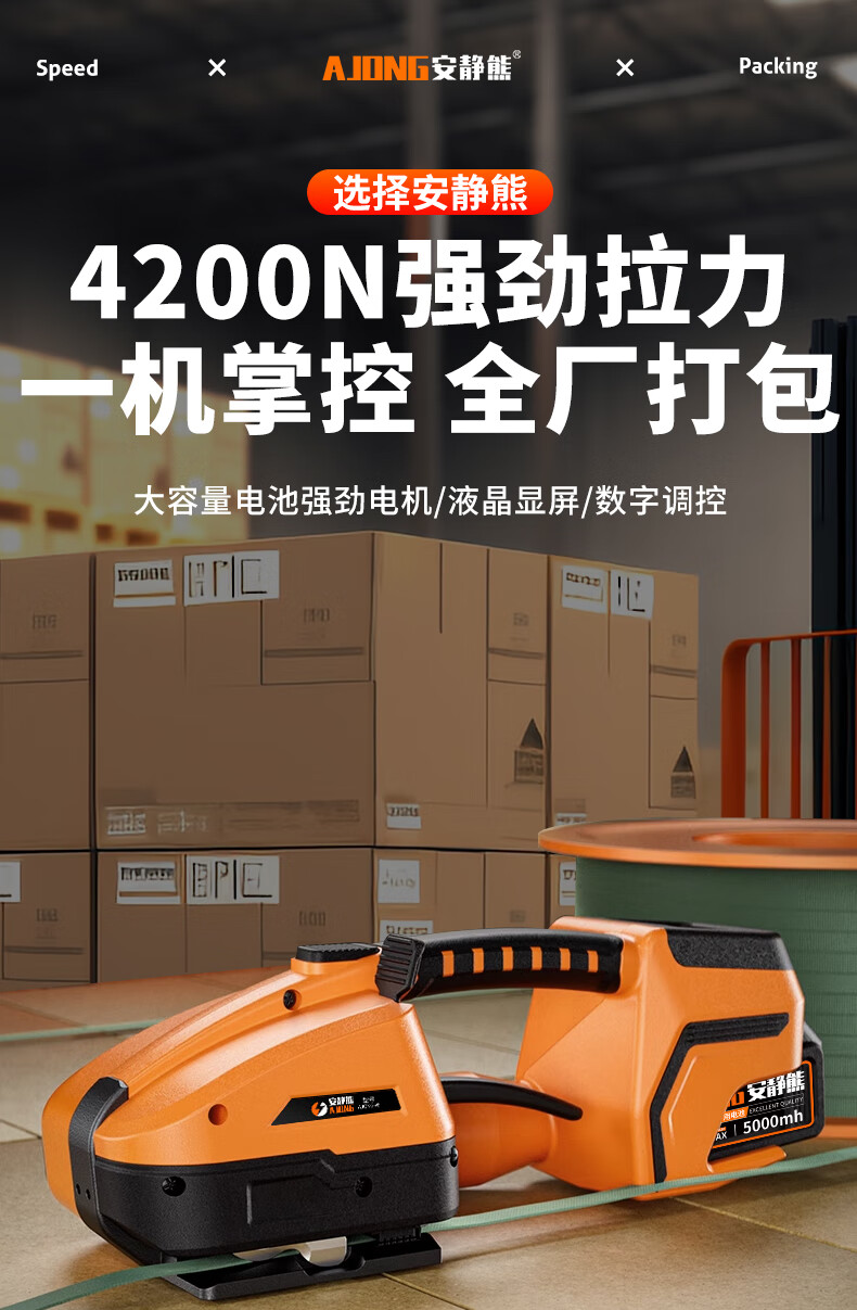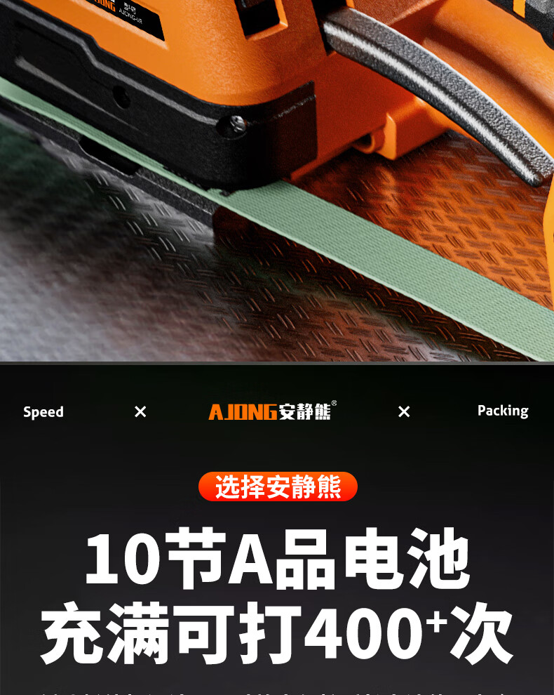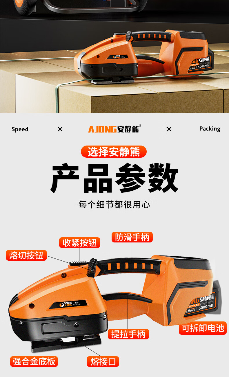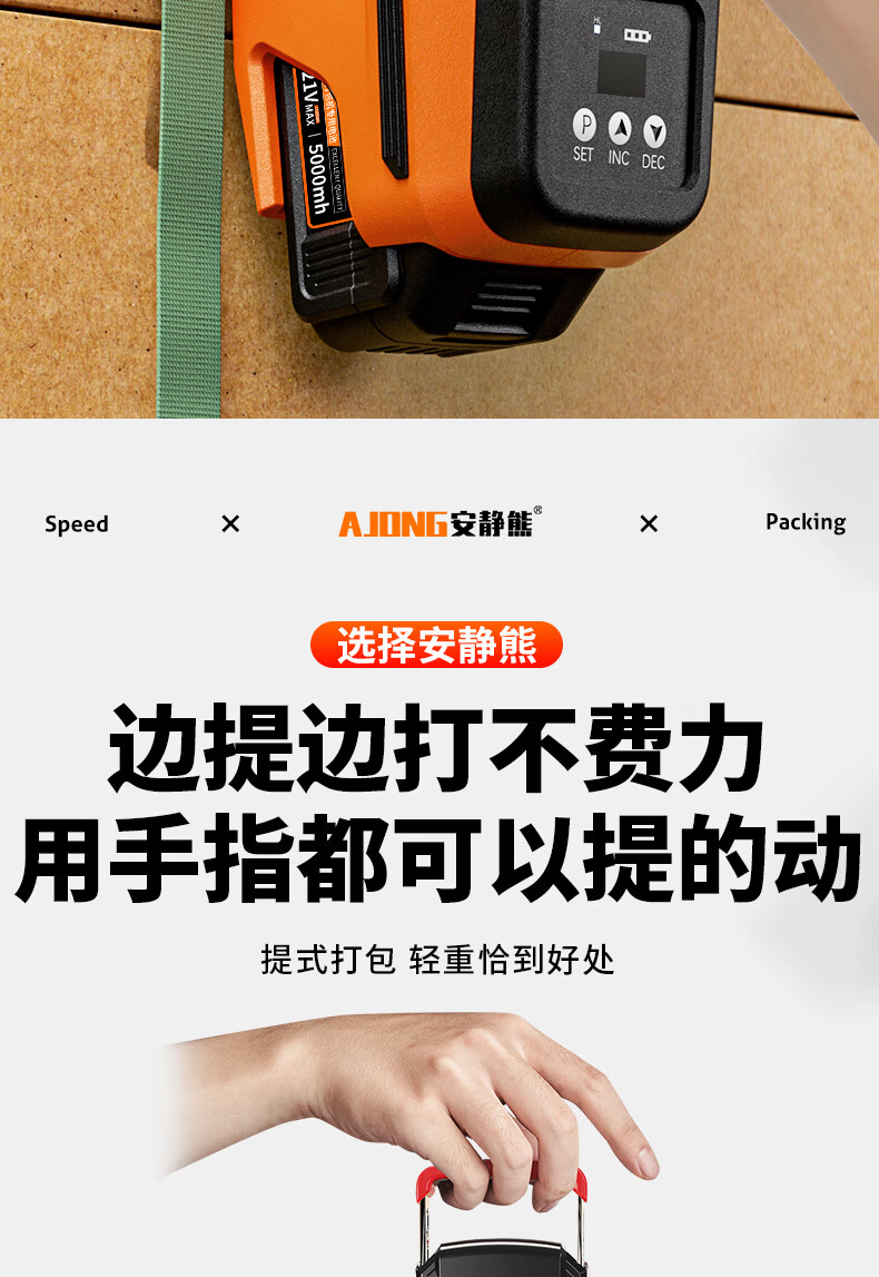 • 商品名称:安静熊电动打包机全自动捆扎带收紧一体捆扎热熔断手提式电动塑料带PP带 AJONG-V8/台