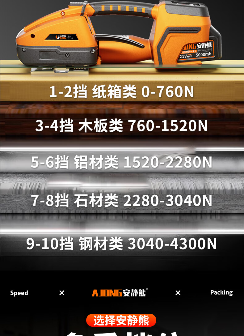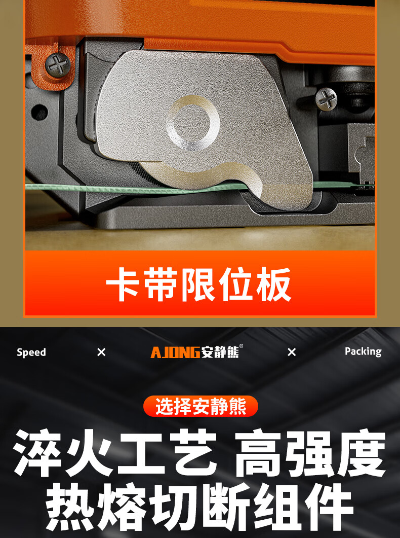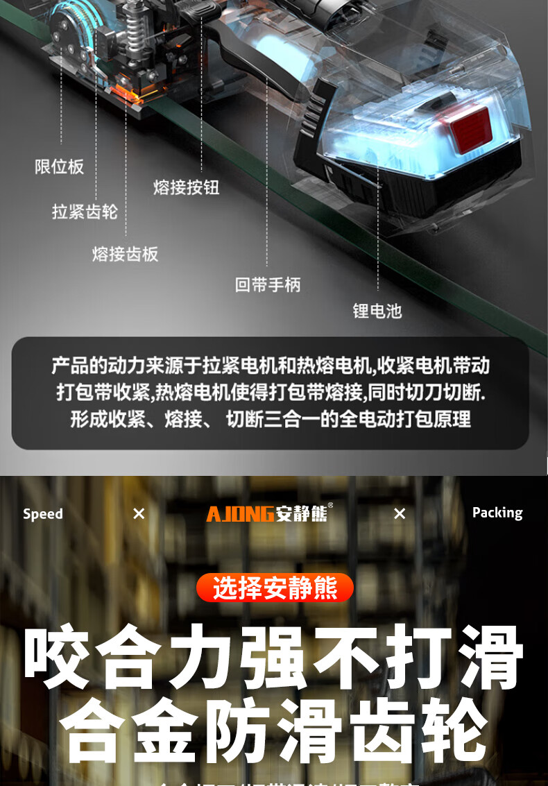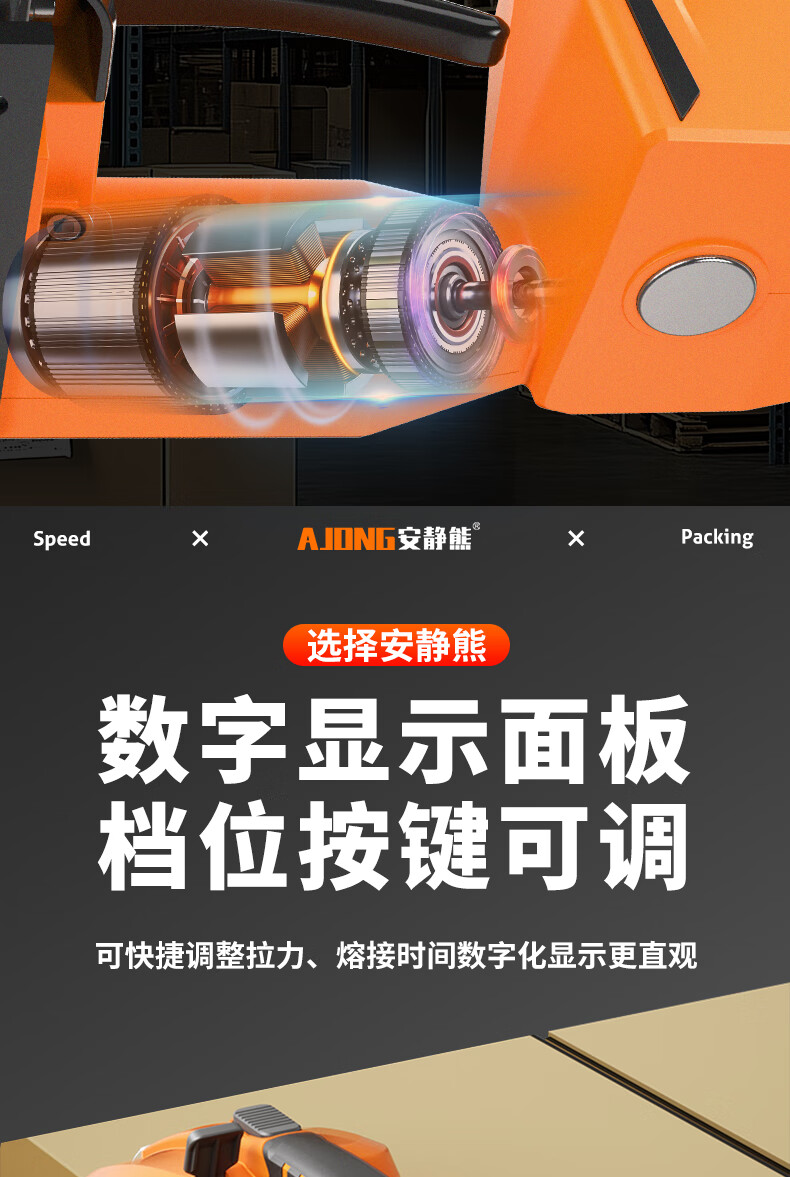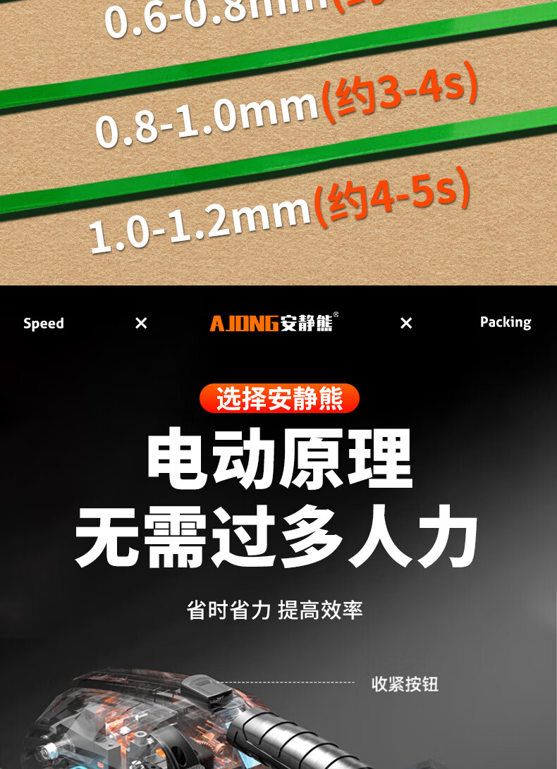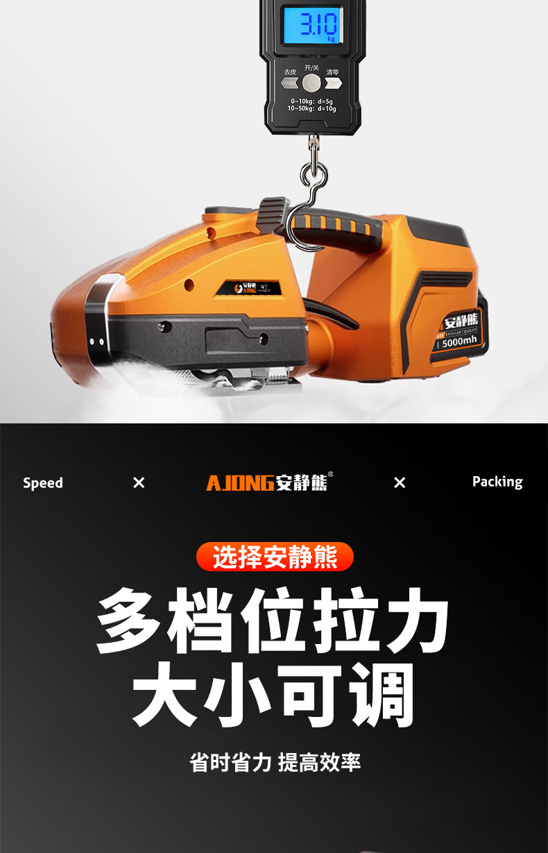 • 商品名称:安静熊电动打包机全自动捆扎带收紧一体捆扎热熔断手提式电动塑料带PP带 AJONG-V8/台