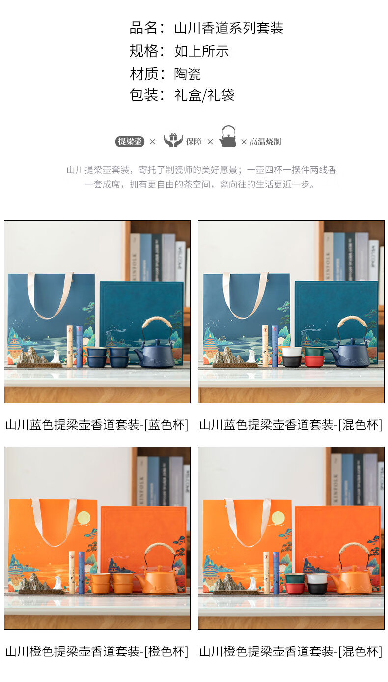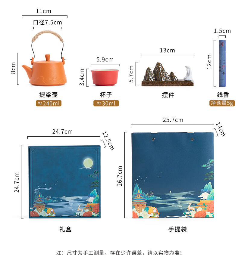 包装清单: 提梁壶-1,杯子-4,香薰-1,香插-1,礼盒-1,礼袋-1