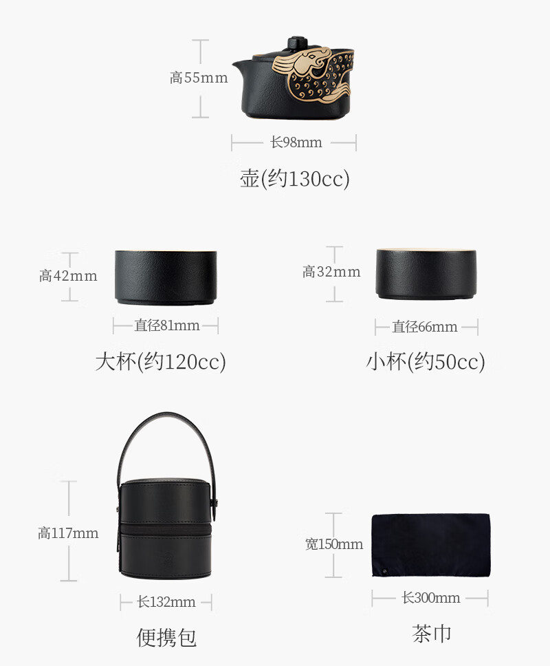 包装清单: 茶杯*2、茶壶*1、便携包*1