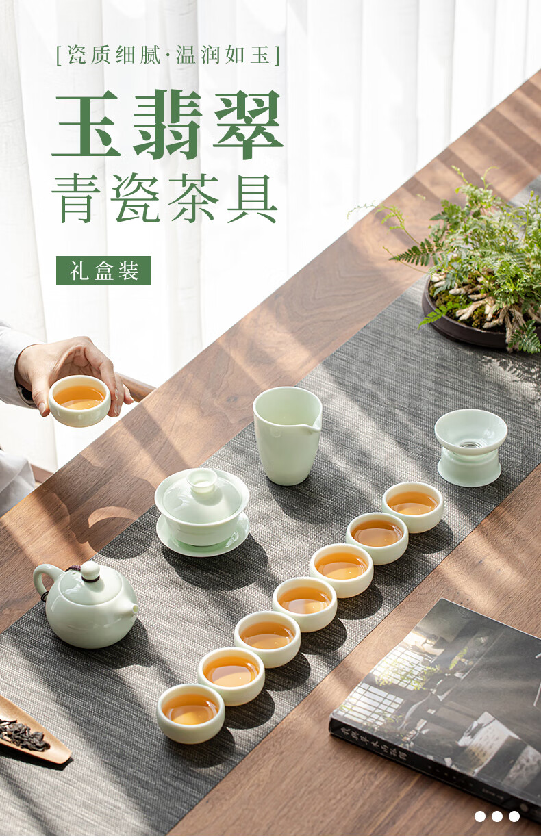 • 商品名称:苏氏陶瓷新年礼物翡翠玉功夫茶具套装羊脂玉陶瓷盖碗青瓷茶壶组节日礼盒装 整套茶具/套
