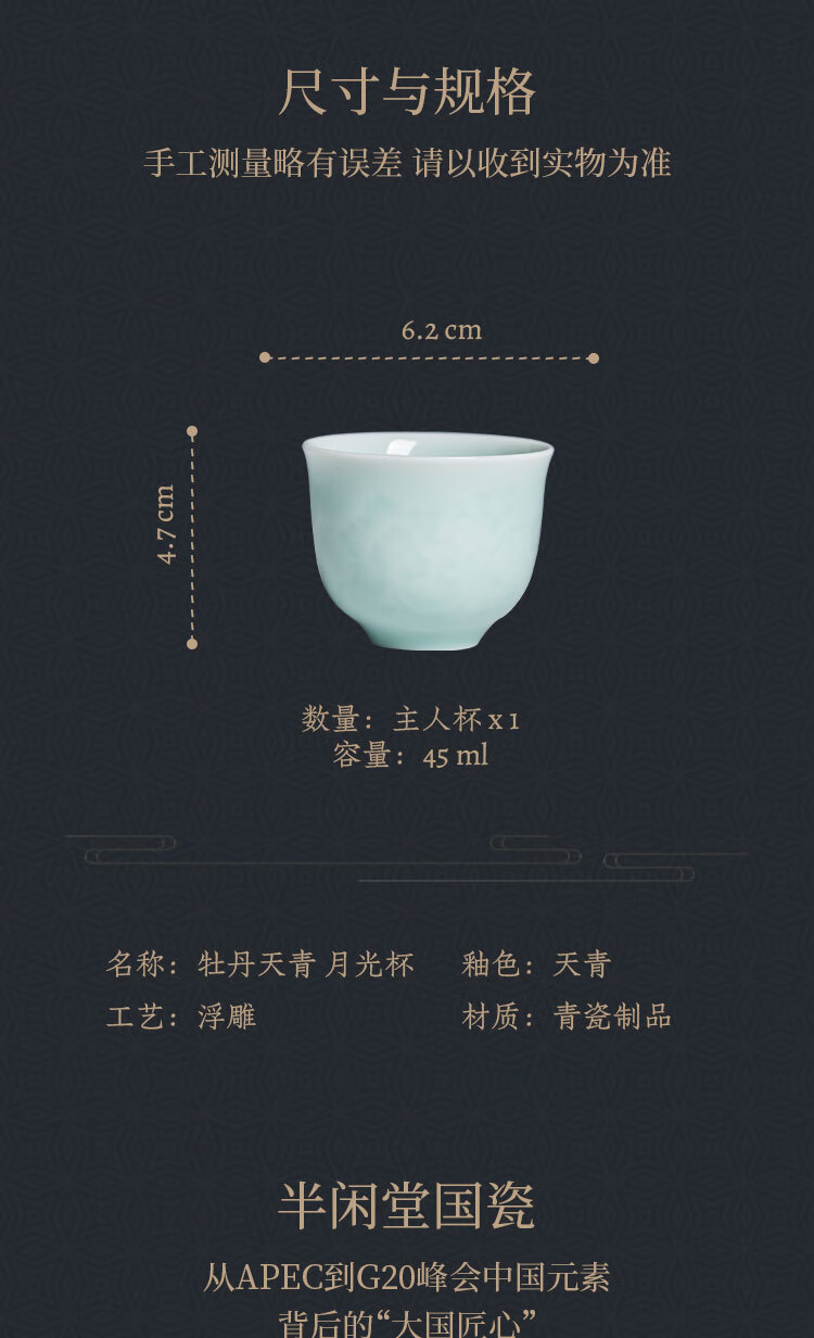 • 商品名称:龙泉半闲堂牡丹天青·月光杯青瓷茶杯中式办公杯带盖家用杯子陶瓷水杯1件 BXT022/件